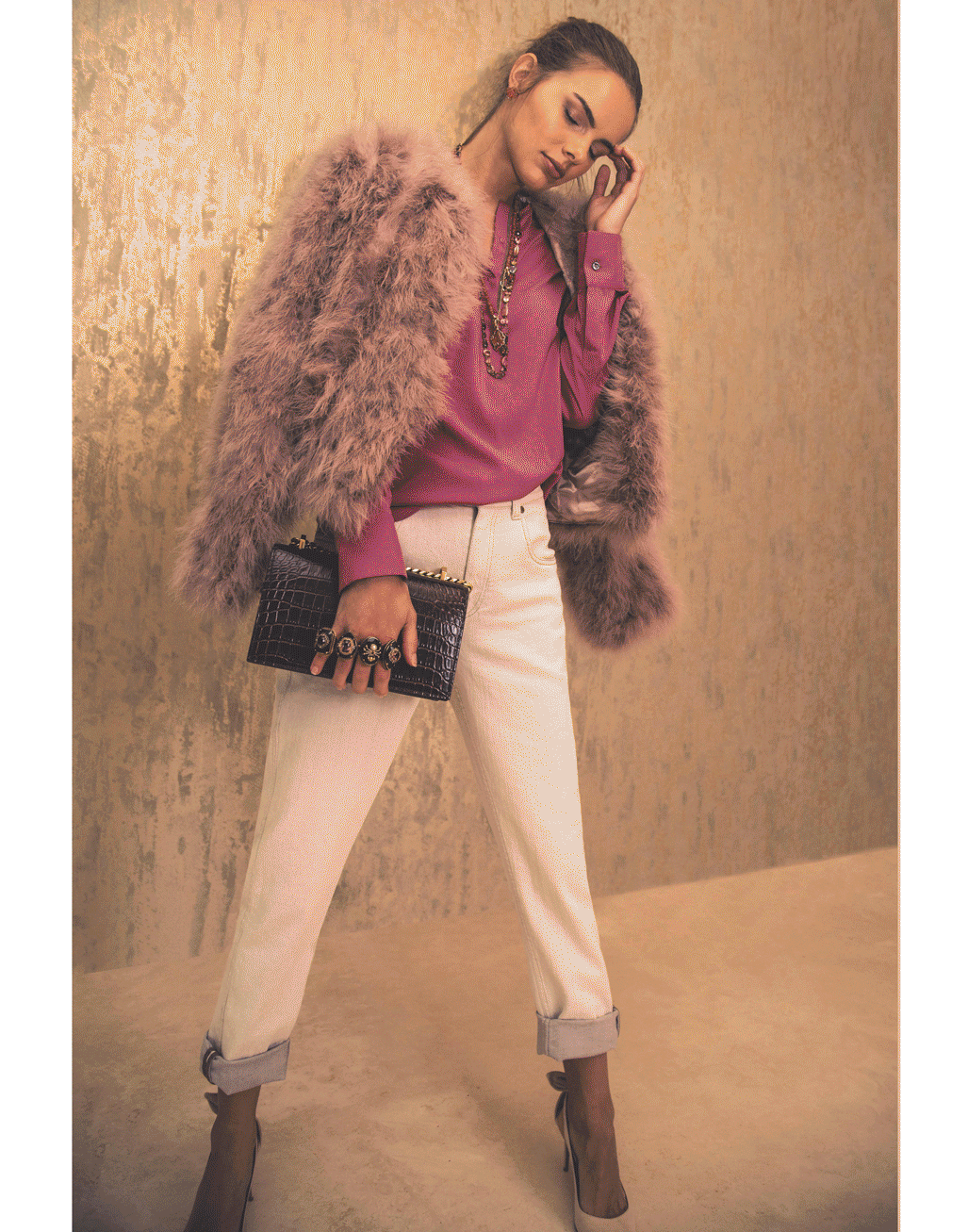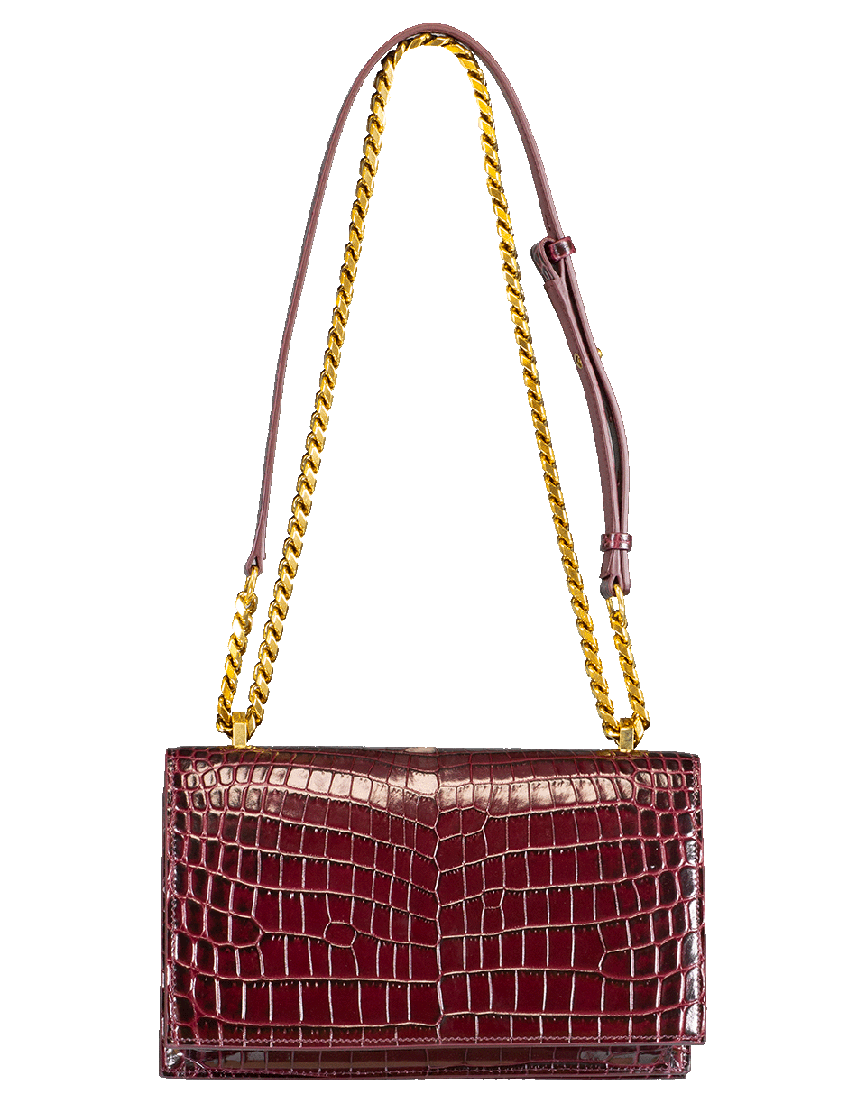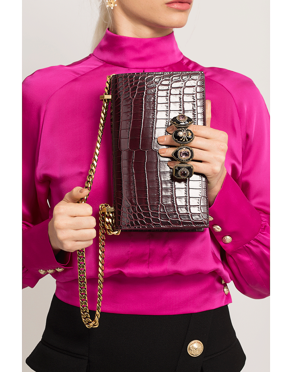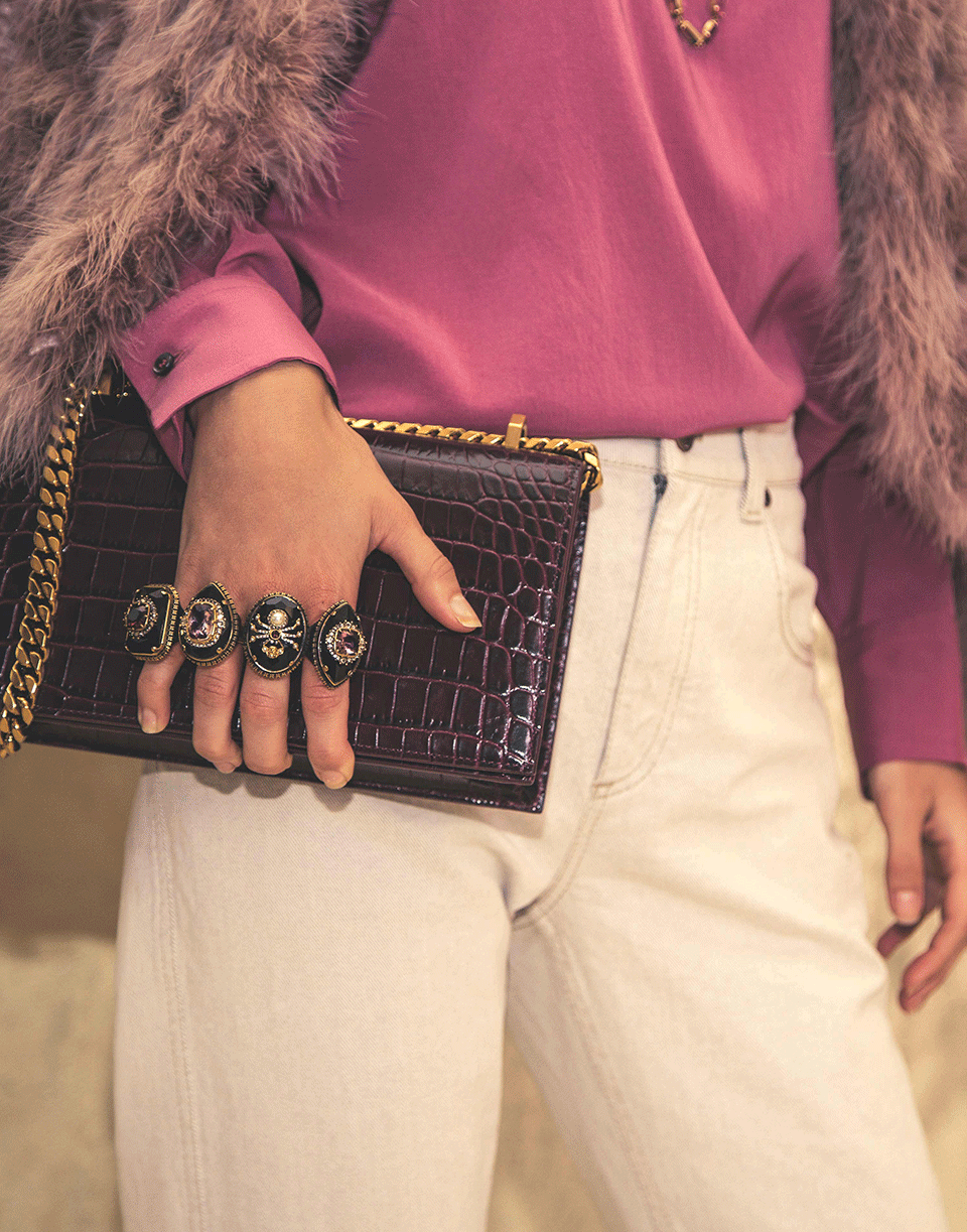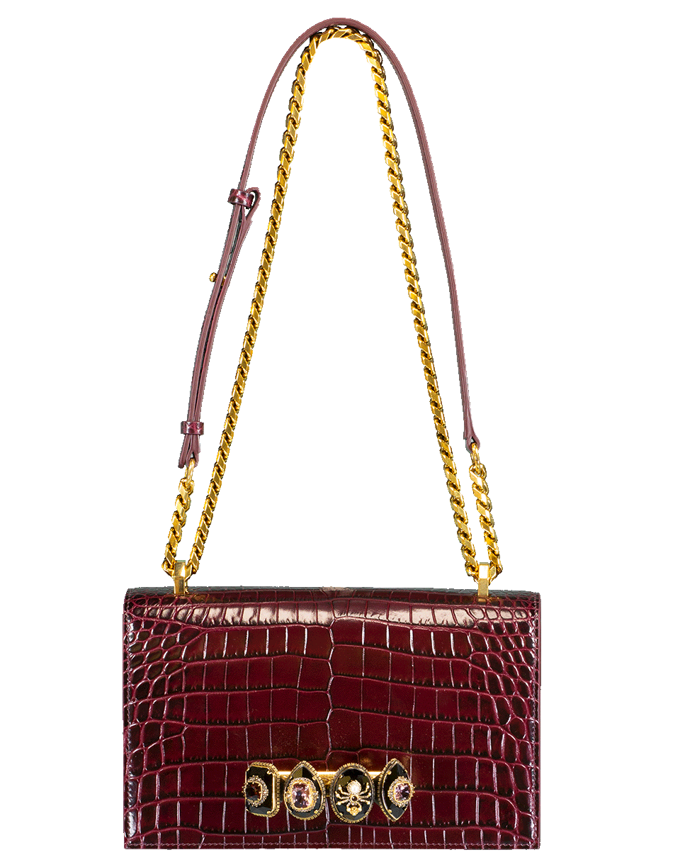 Jeweled satchel by Alexander McQueen. This embossed croc calf leather bag features a magnetic flap closure, two interior compartments and a zip pocket, adjustable leather chain strap, gold tone hardware and finished with a crystal encrusted four ring adornment.