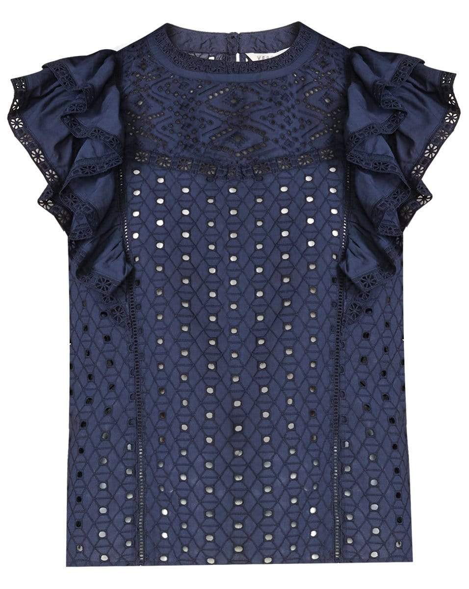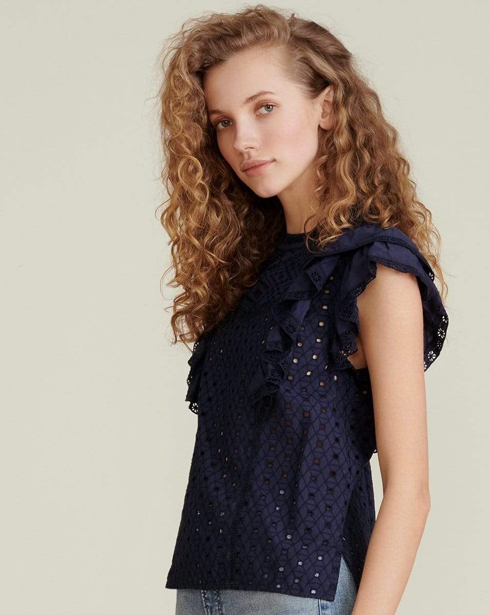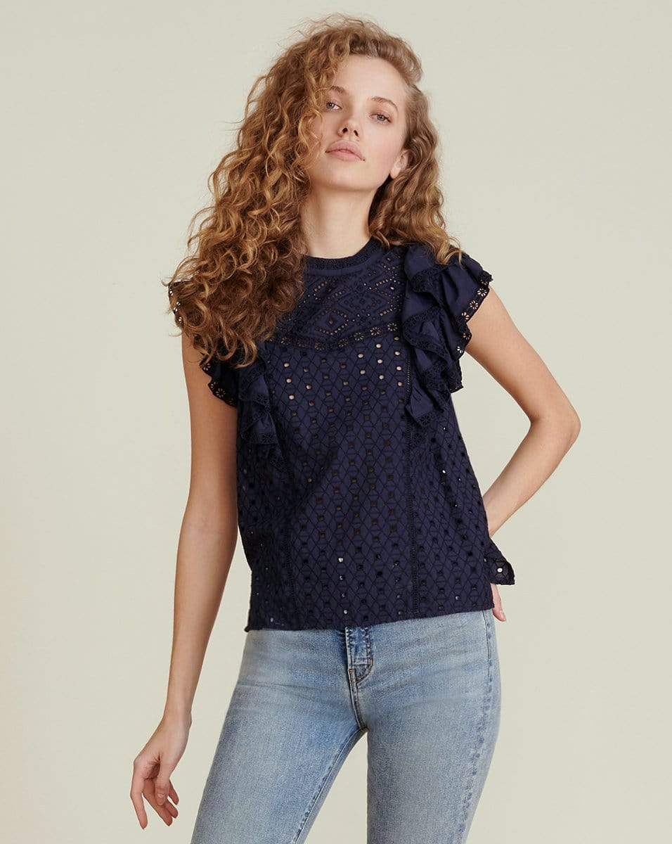 In washed cotton, the Veronica Beard Jie top features delicate eyelet embroidery and romantic ruffle detailing. Balance the feminine style with distressed jeans and sneakers for an on-trend moment. Round neck. Sleeveless. Relaxed fit. Unlined.