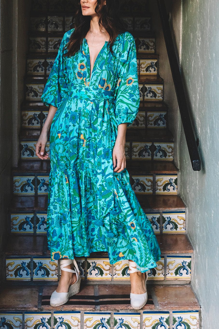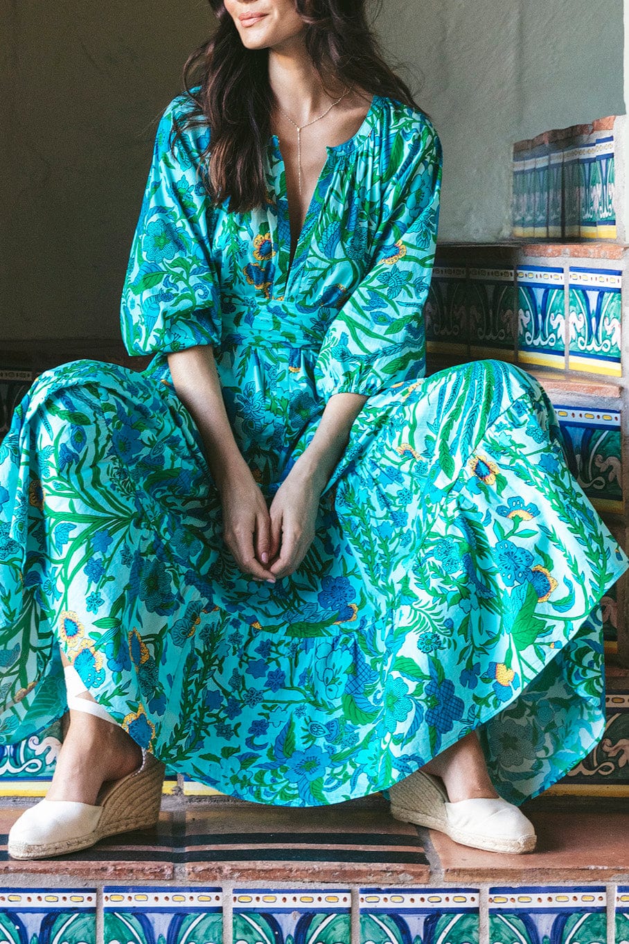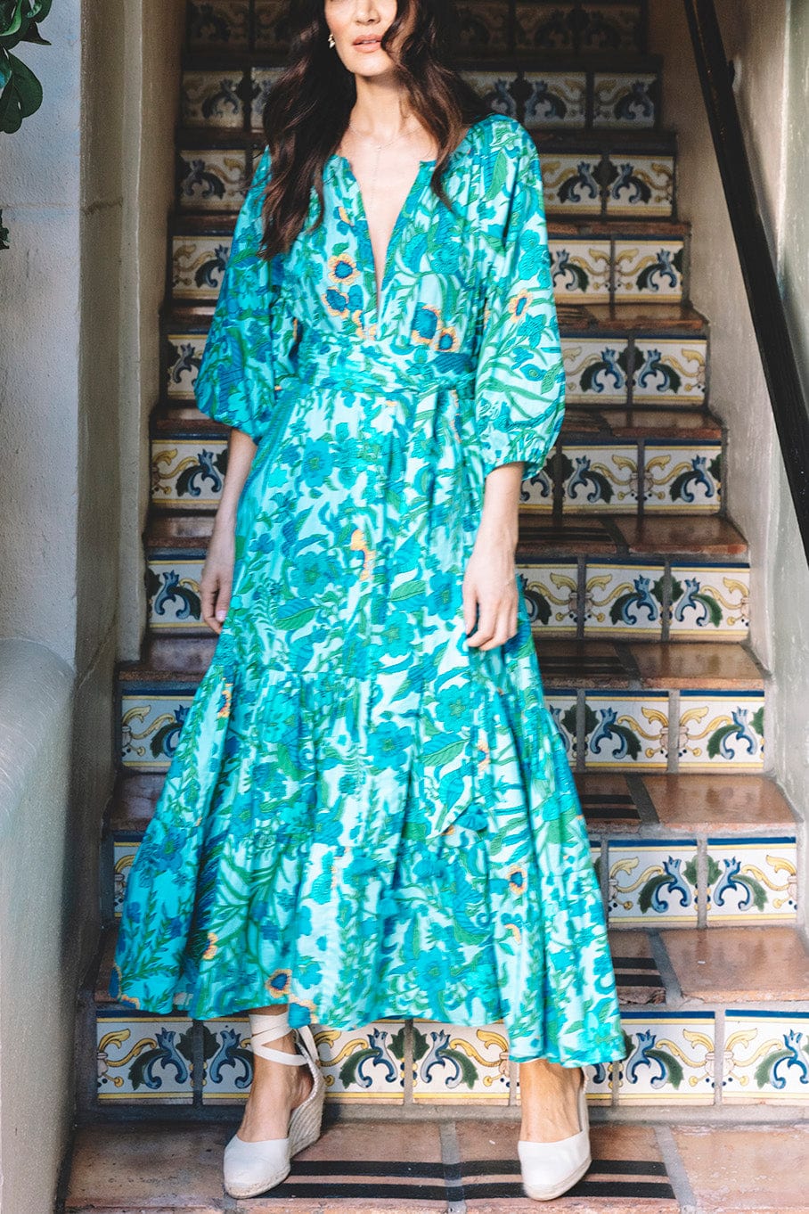 Figue johanna dress in birdsong blue. The Johanna Dress is printed perfection. This style features raglan blouson sleeves with elastic cuffs, an adjustable hook and eye v-neckline, a self-belt with Trapunto stitching, and soft shirring at the shoulders and ruffled skirt tiers.