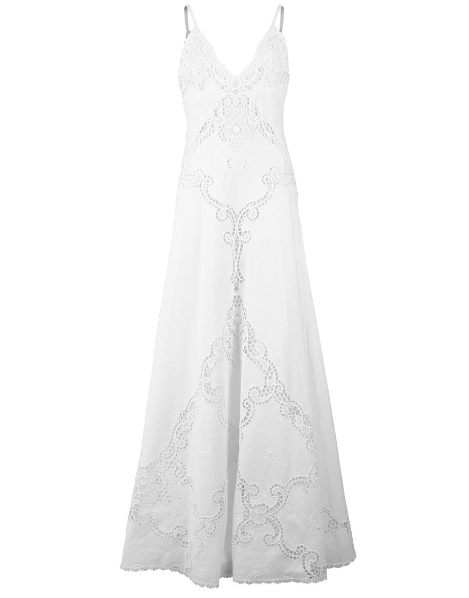 Jonna linen triangle-top gown with traditional greek reticella lace detail in white.