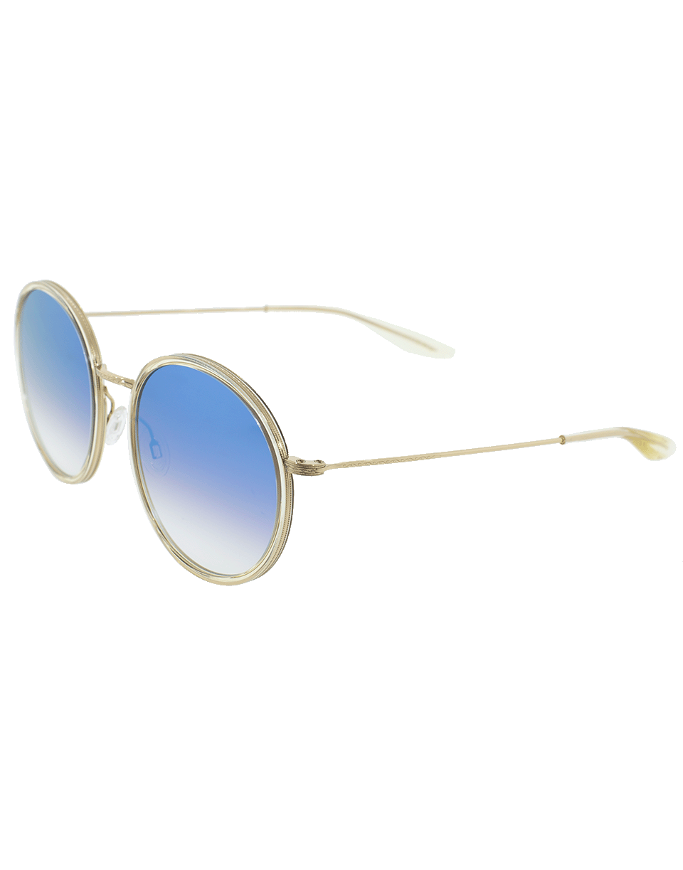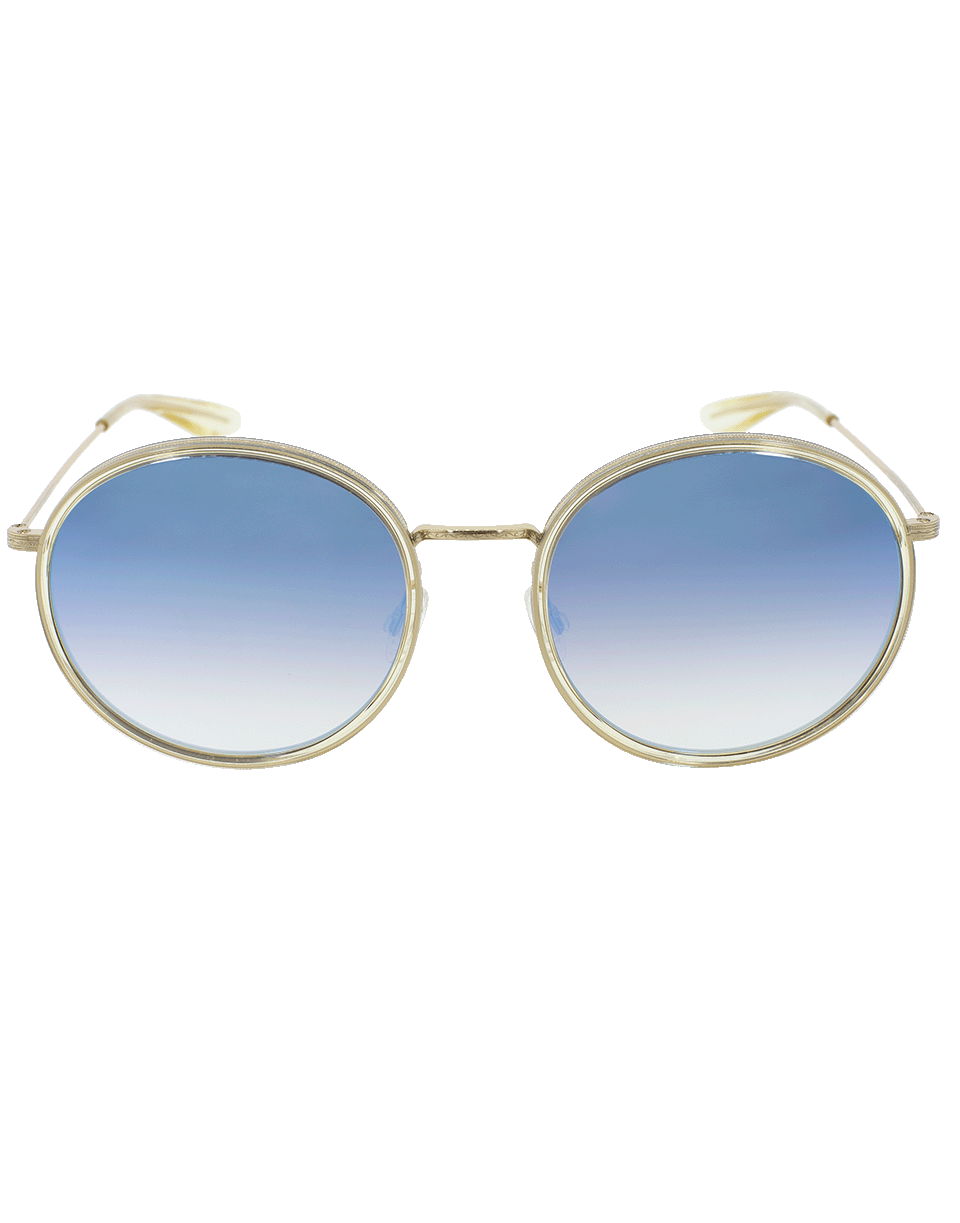 These vintage inspired frames from Barton Perreira feature an oversized round silhouette on gold tone metal and arctic blue lenses.