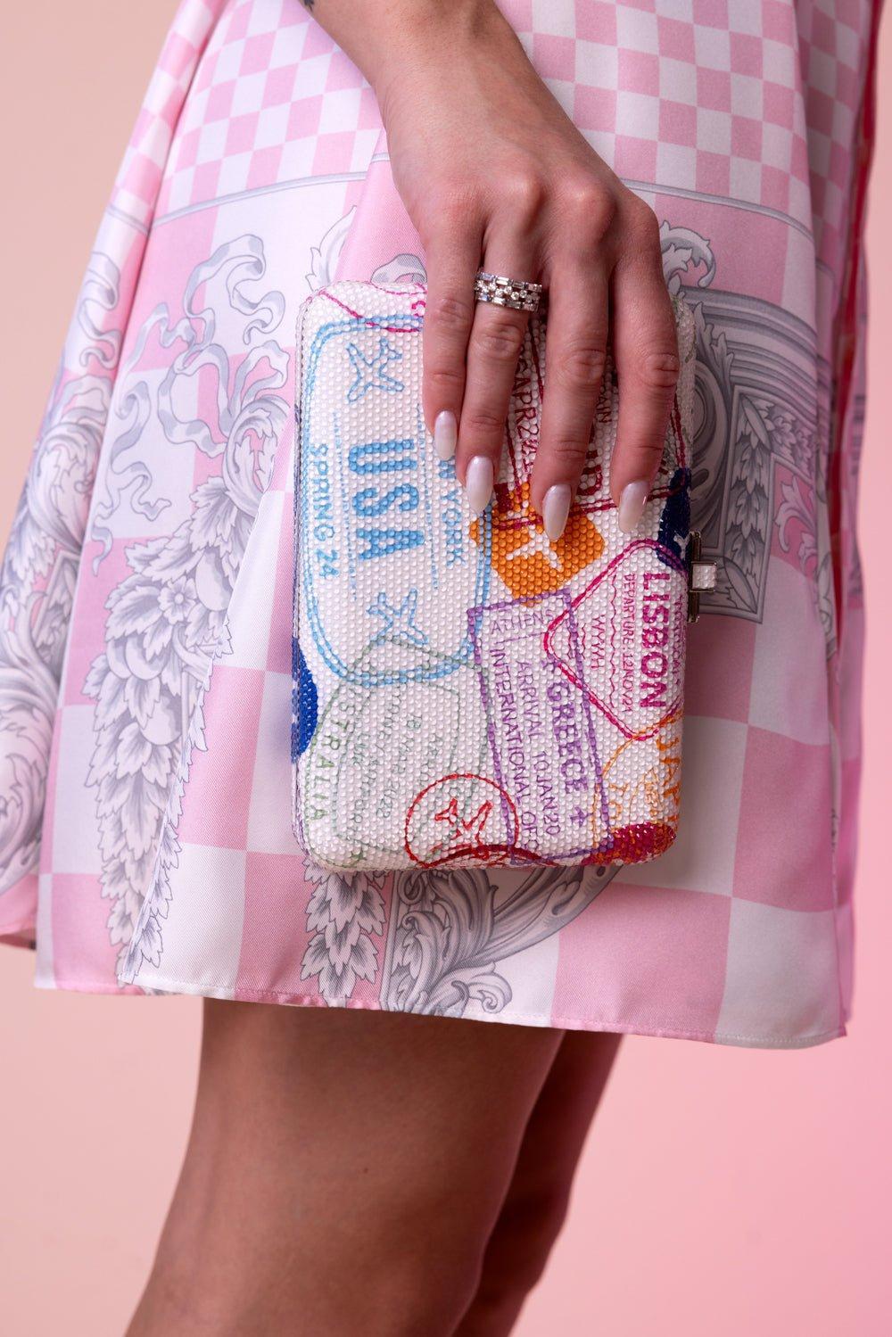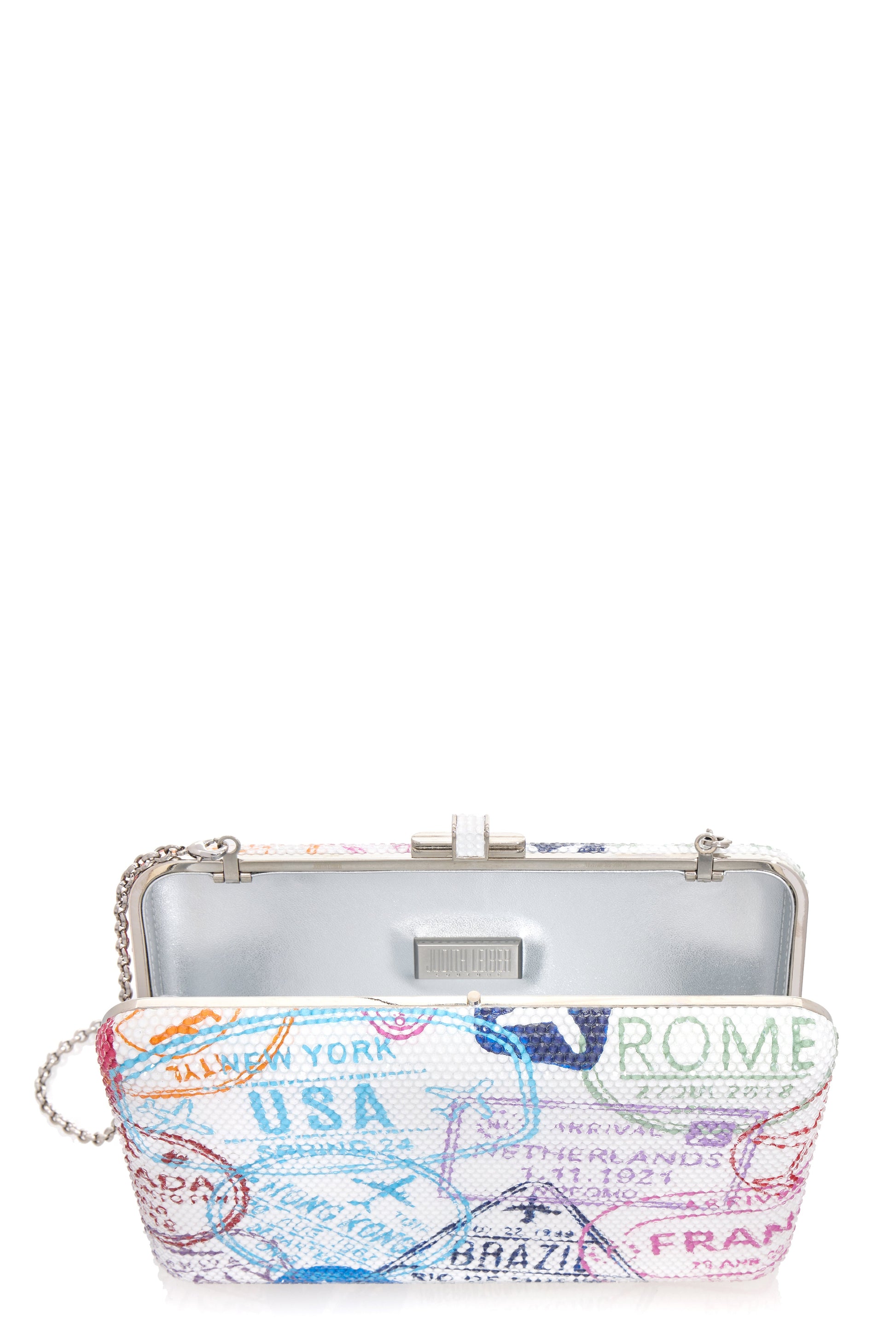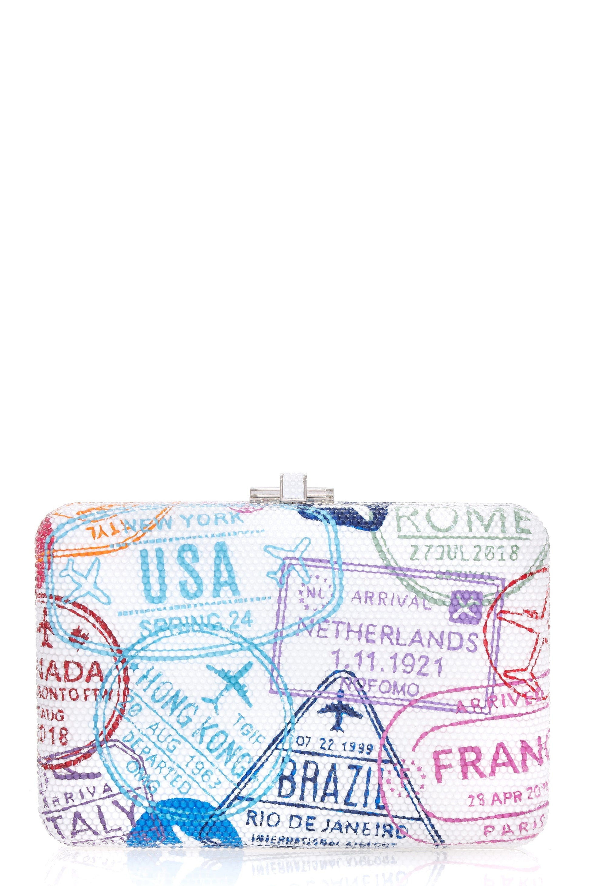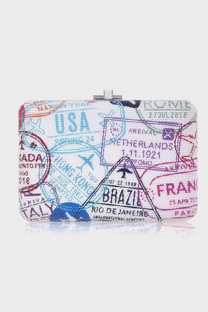 Judith Leiber slim slide clutch in passport stamps.