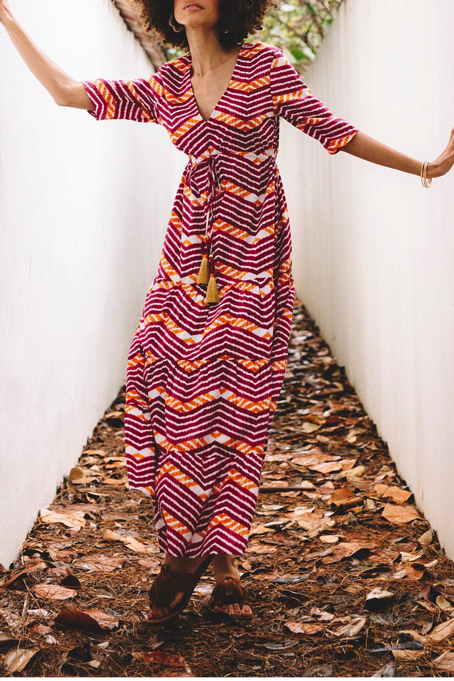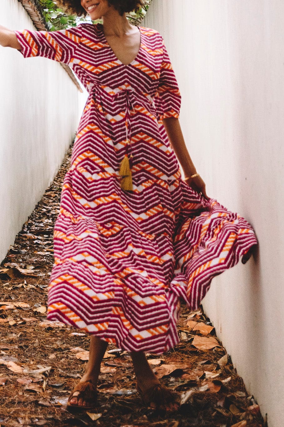 Figue kalila dress in chevron pink. This elegant tiered maxi features a full skirt and a figure-defining empire waist cinched with a gorgeous gold-threaded tassel drawstring. With slim, elbow-length sleeves that can be cuffed to show a little more skin.
