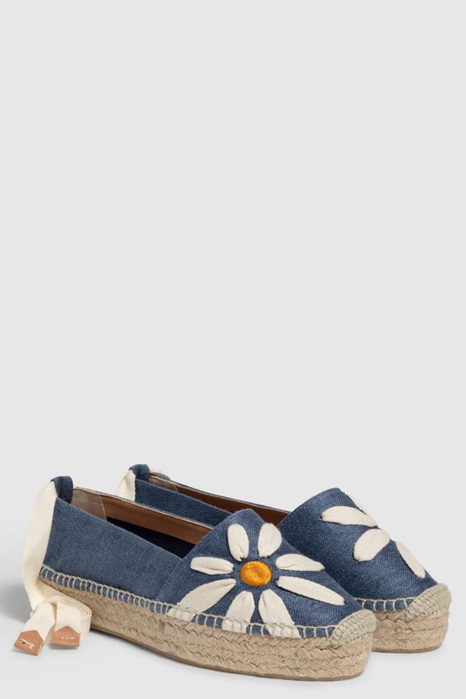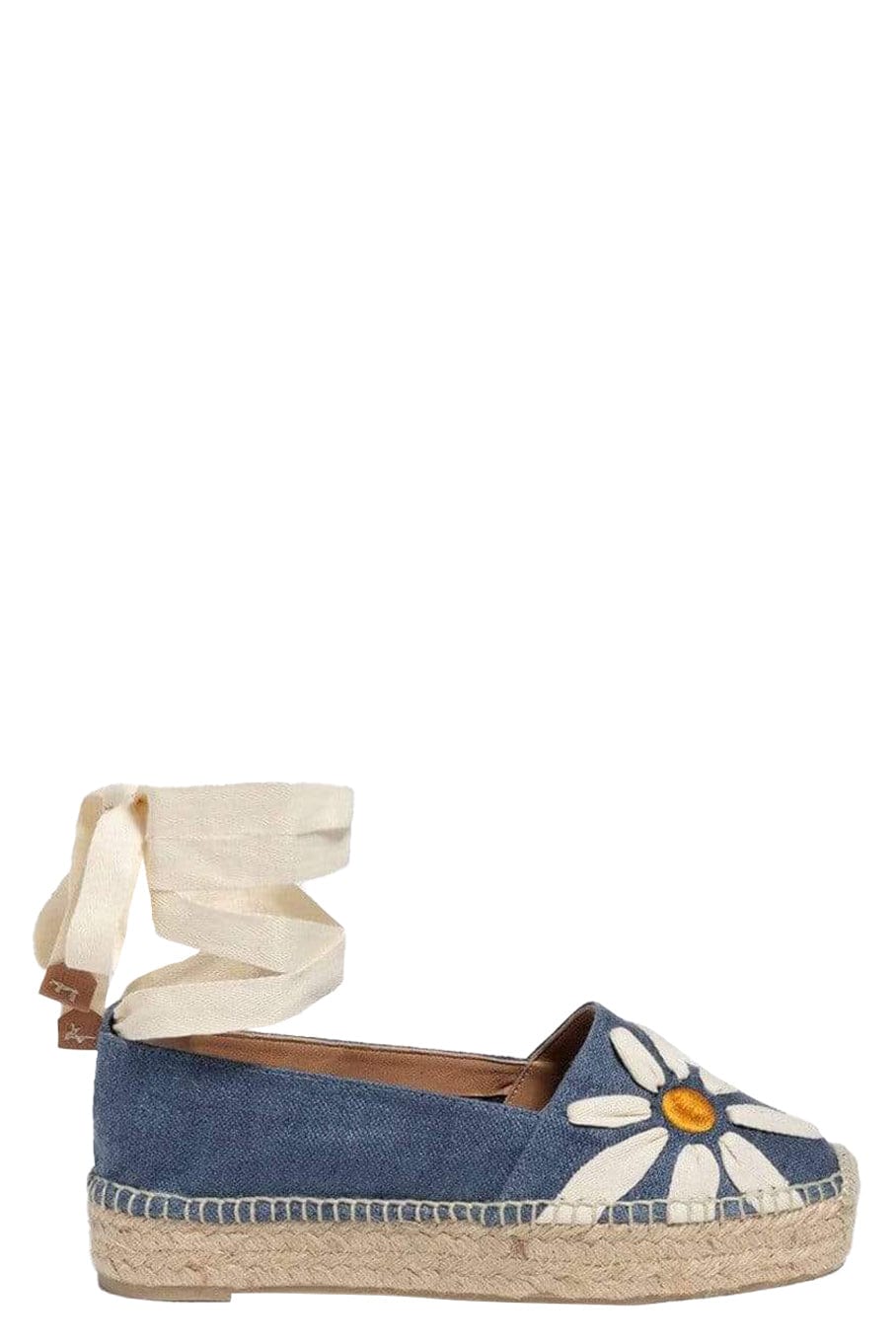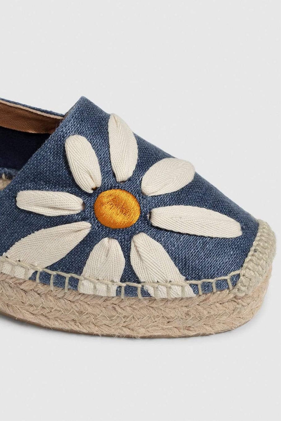 Castaner flat Karenina espadrille made of linen. Design with flower motif. Lace up fastening. Rounded tip. Vulcanized sole of jute natural colour and rubber. Sole of 3cm.