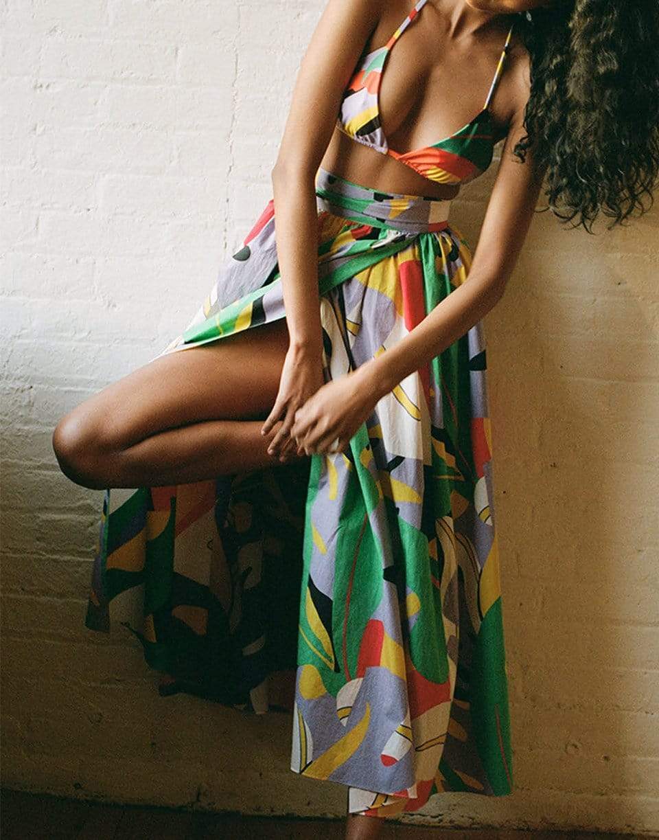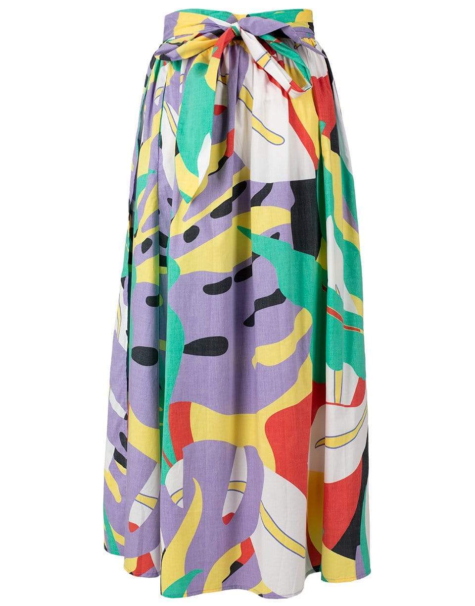 A true wrap skirt in a custom Mara Hoffman botanical print, made from 100% organic cotton. The Katrine skirt is fitted at the waist with shirring for volume and shape. Features an attached wrap belt and front pockets.