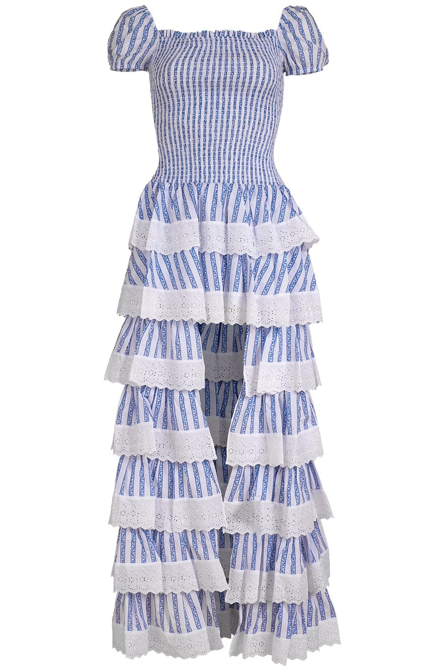 Caroline Constas keegan off the shoulder gown in white blue toile stripe.