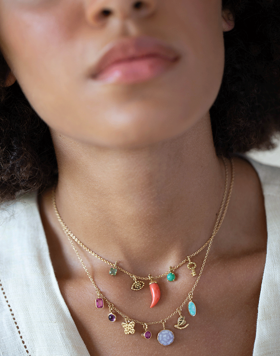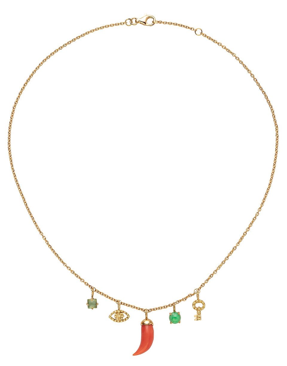 Gaya mini key, green tourmaline, coarl, green turquoise and mini eye charm necklace in yellow gold.