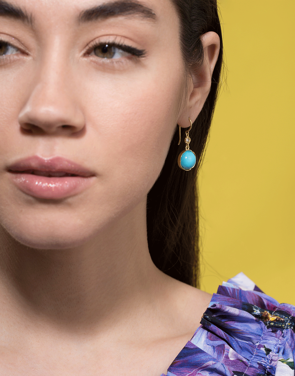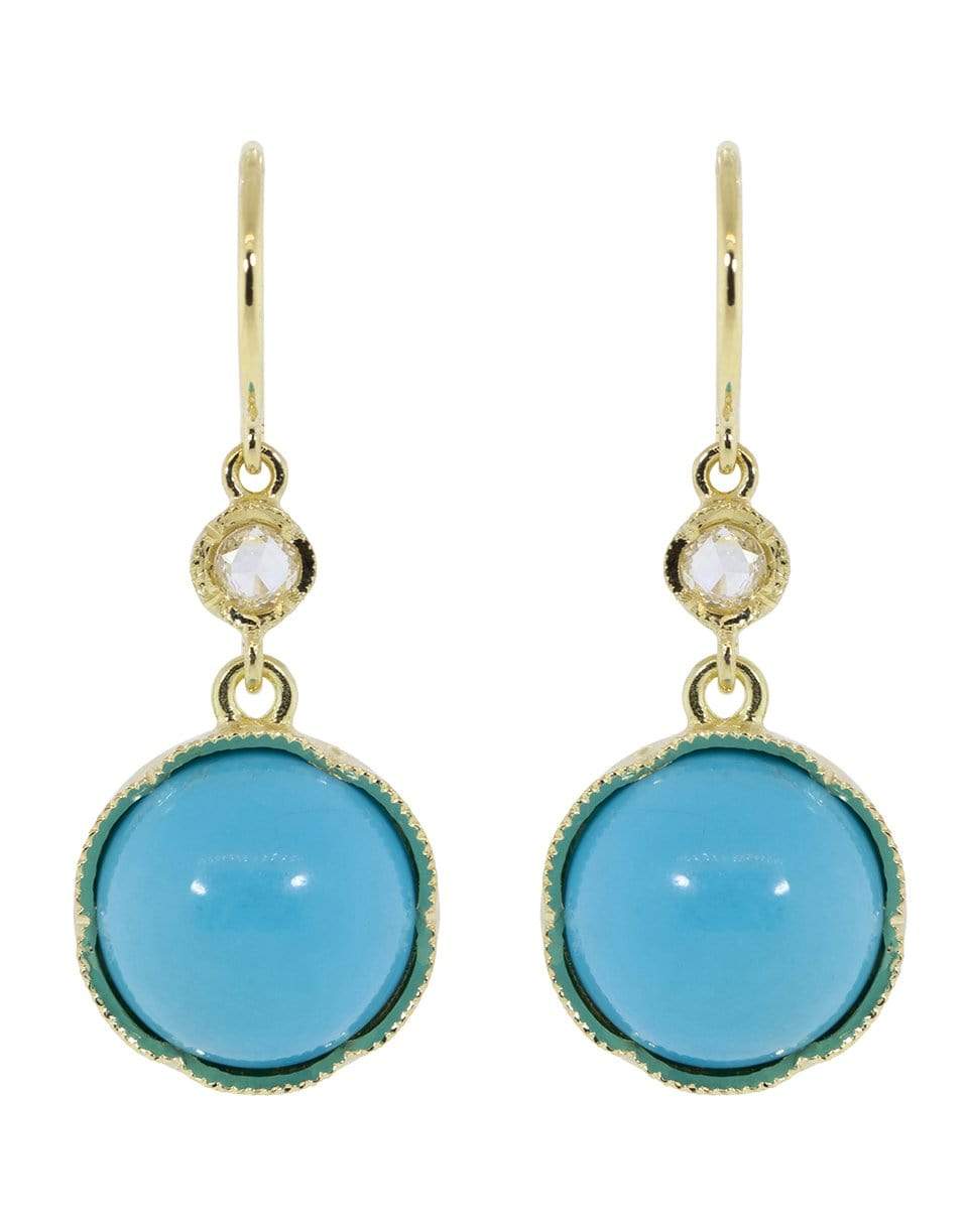 Irene Neuwirth kingman turquoise and rose cut diamond drop earrings set in 18k yellow gold. For pierced ears.