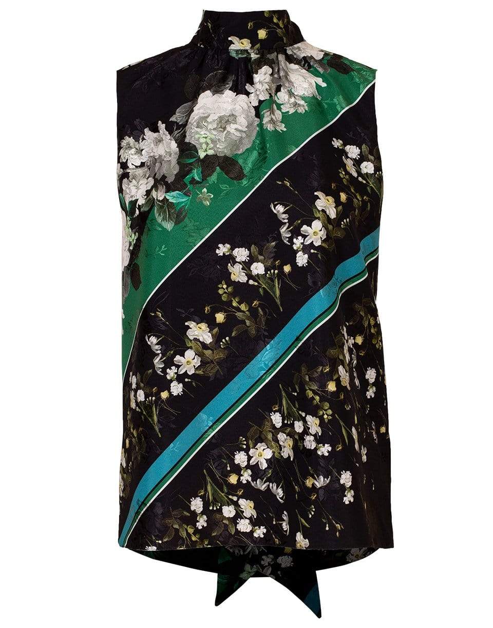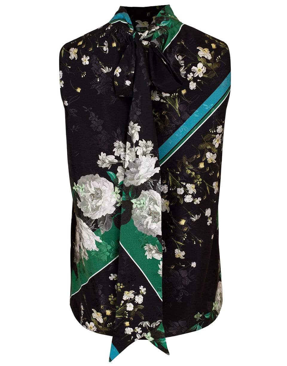 Erdem satin jacquard sleeveless Koren daffodil print blouse featuring a regular fit, mockneck with tie detail, and a concealed back zip closure.