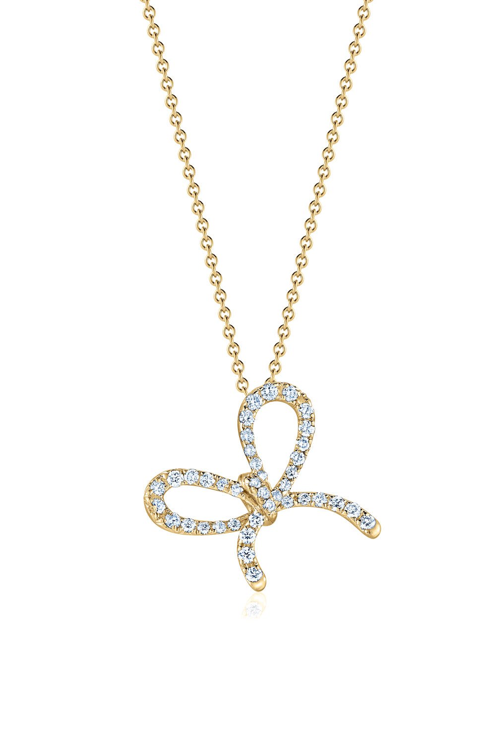 Kwiat element bow diamond pendant necklace in yellow gold.