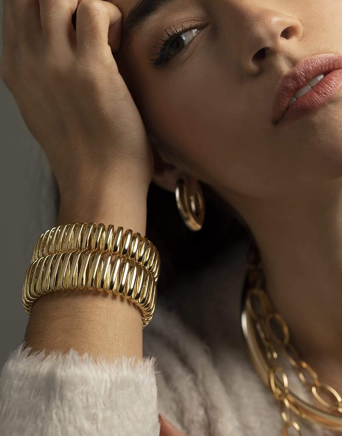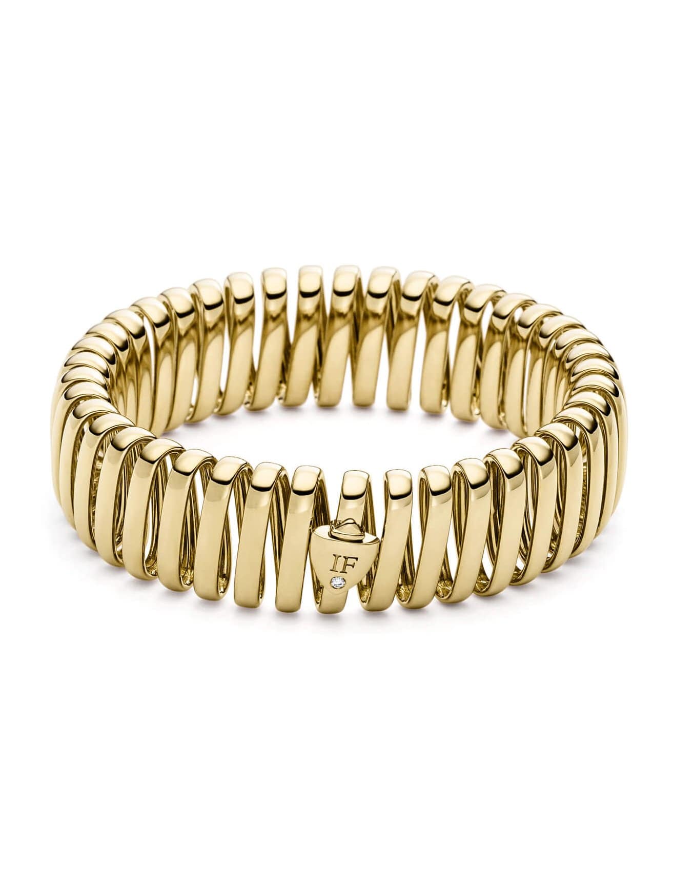 IsabelleFa L'Elastique bracelet 17mm. Traditional goldsmith's craft in its most flexible form: a hair tie was the inspiration for our latest pieces of jewelry from the Flix.Flex family. Named after the French word for rubber (band), the "L'Élastique" bracelets are not only reminiscent of this in terms of their design, but above all because of their flexibility. The jewelry, made exclusively from 18 carat gold, can be stretched and contracted again by itself. As a result, they can be comfortably slipped on and nestle perfectly on every woman's wrist. Available in widths of 17 mm and 21 mm.