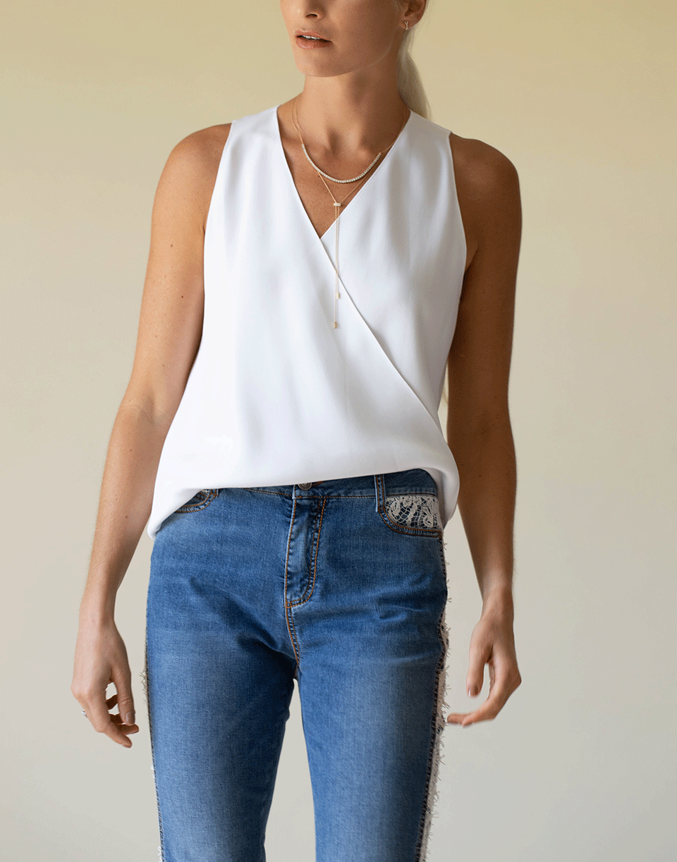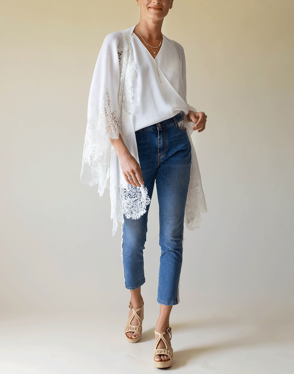 Ermanno Scervino lace tux stripe mid-rise jean with a slim leg, five pocket style, and a zip fly.