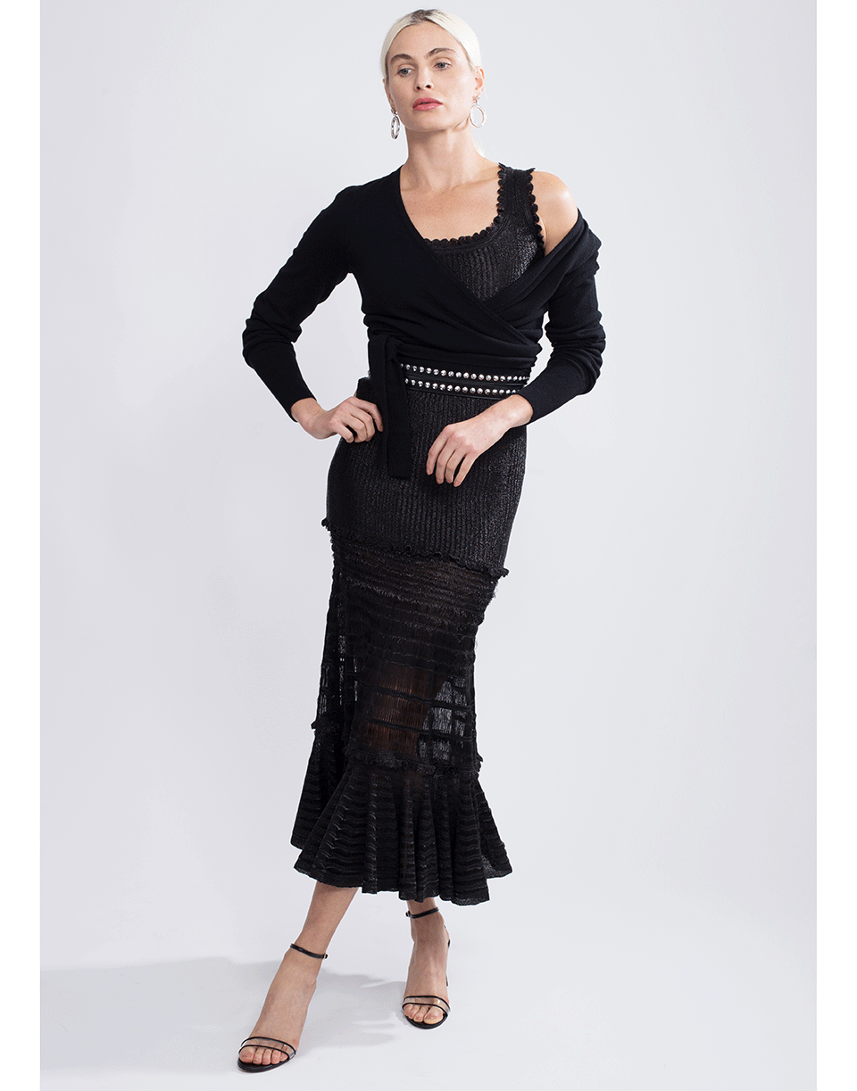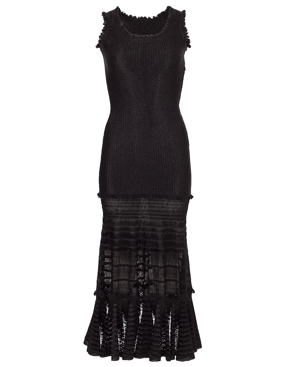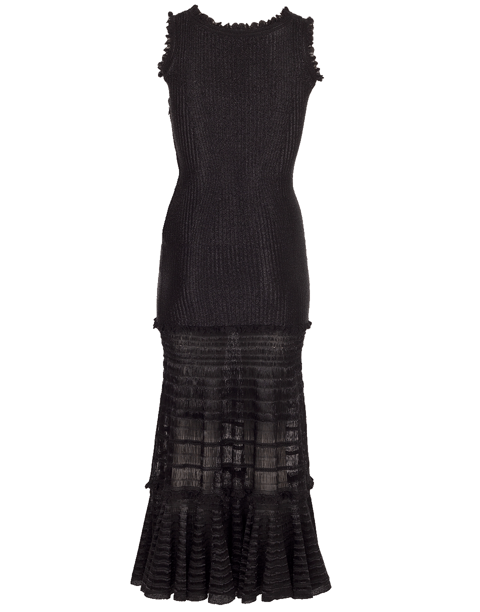 Woven knit midi dress from Alexander McQueen featureing a slim fit, sleeveless cut, scoopneck, knitted frills and ladder detailing, and finished with a concealed zip at back.