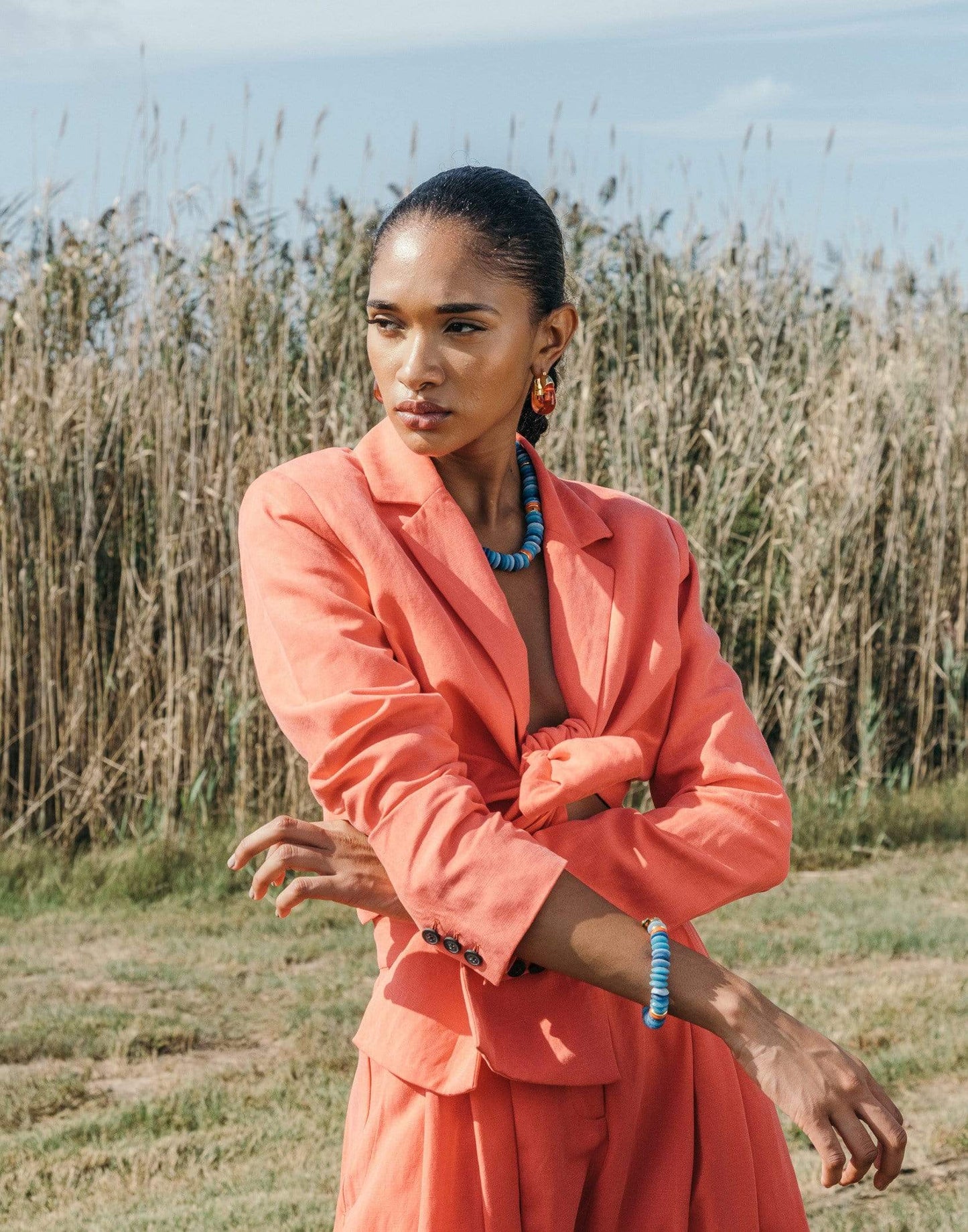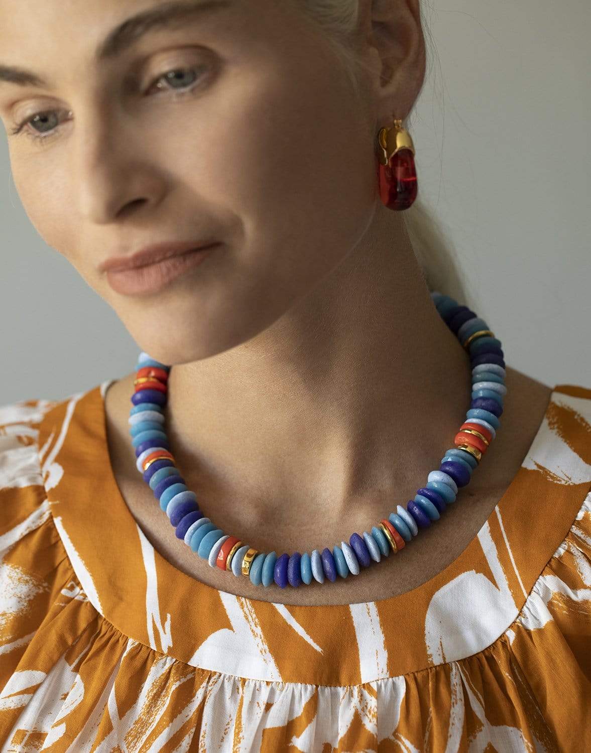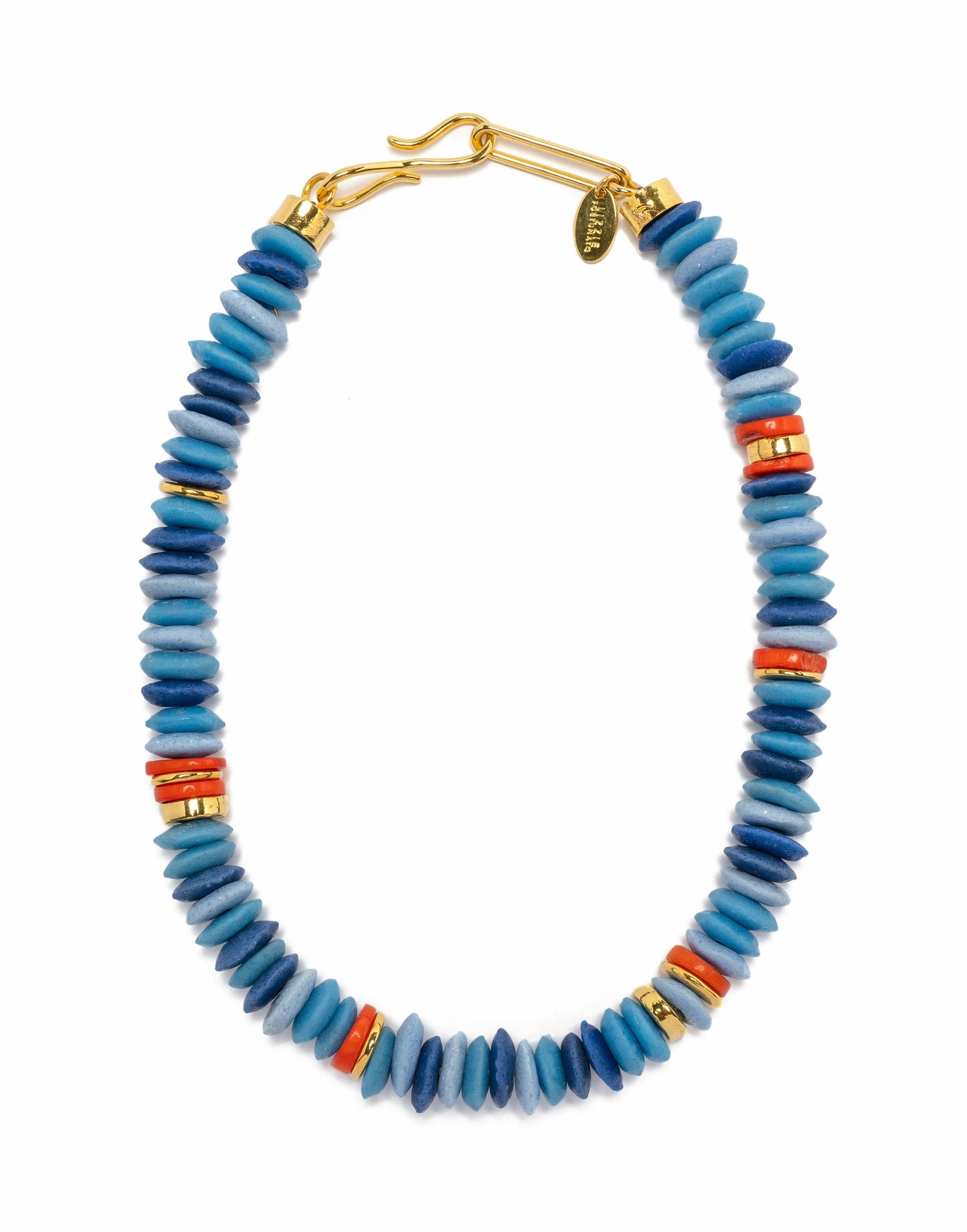 Lizzie Fortunato laguna necklace in denim. A perfect blend of easy elegance and ethical construction, this Laguna single-strand necklace will fit your style like a favorite pair of jeans. Now in multihued blue recycled glass beads, with bamboo coral and gold-plated brass S-hook closure.