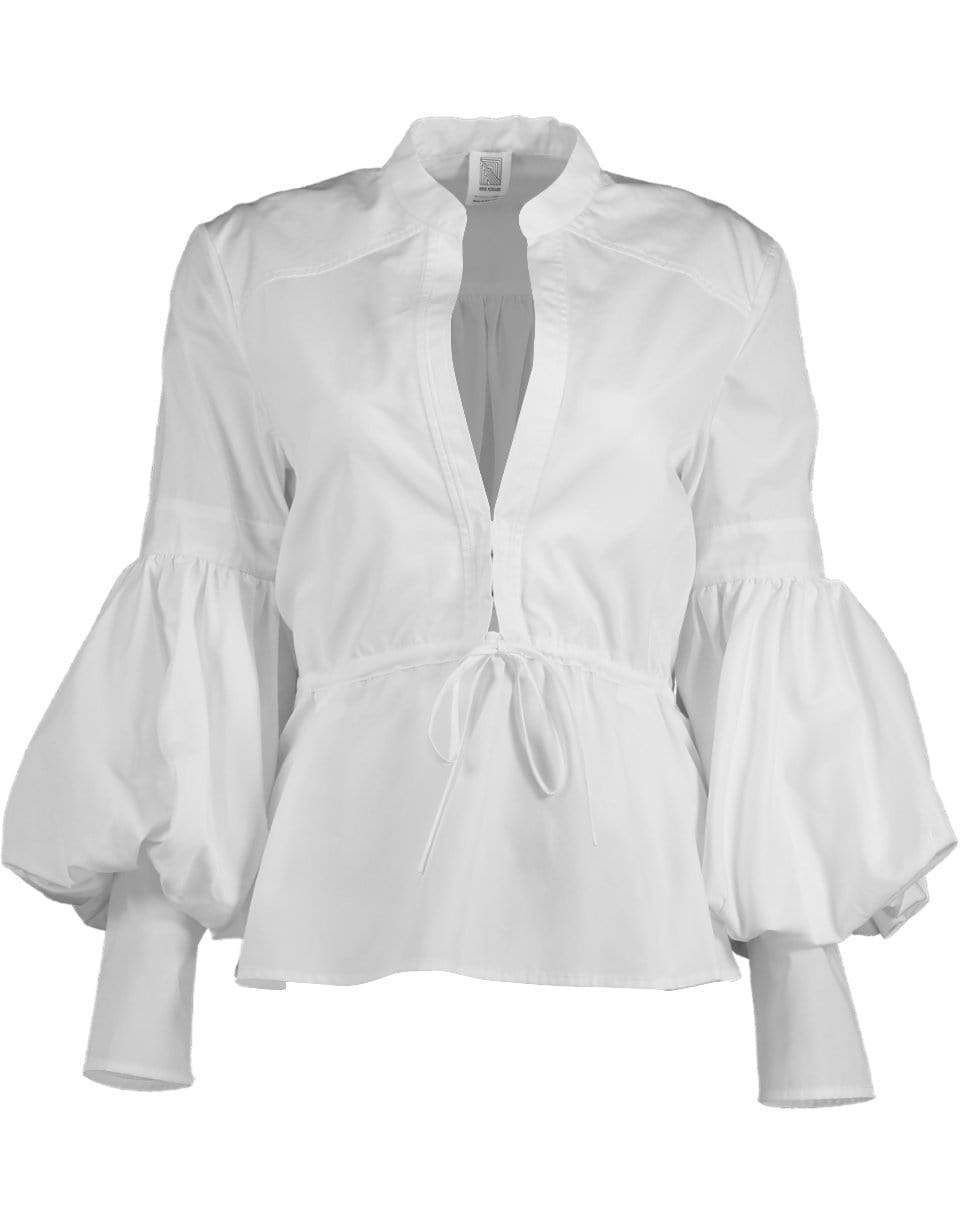 Rosie Assoulin Lantern Sleeve Top featuring a subtle peplum silhouette, high cinched waist, low v-neckline, hook-and-eye closures, and long sleeves with a burst of volume at the elbow.