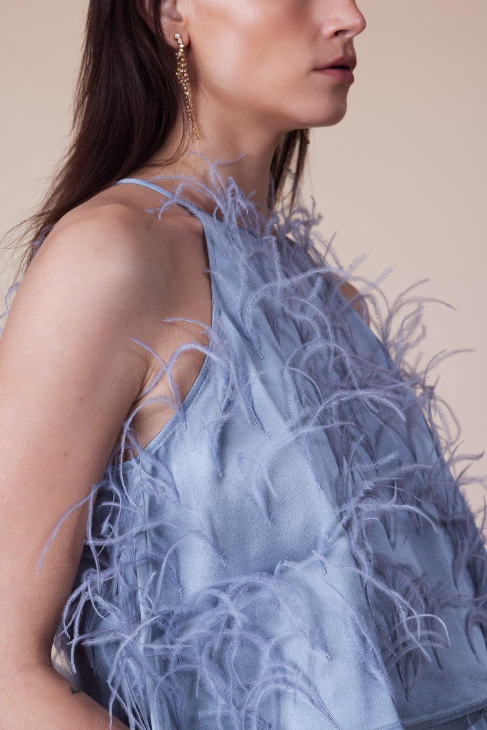 61% ACETATE, 39% VISCOSE, Trim: 100% Real Ostrich Feathers, Dyed Ostrich Feather, Struthio Camelus, Republic of South Africa, Captive, Pieced