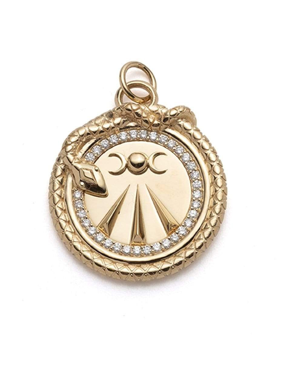 Foundrae large mind body and soul medallion. Handcrafted in 18-karat Yellow Gold, this Large Medallion charm symbolizes Wholeness. Three converging rays of light, like paths, leading to the ascent to higher thinking and a higher state of being. The three pillars of life are Mind, Body, and Soul. At the top of the paths are the three phases of the moon, representing the maiden, mother, and elder. A symbol of the generations of women that have come before us, the mothers of our mothers that have all fought, loved, cried to get to you. Our lunar legacy, our birthright to reach our full potential.