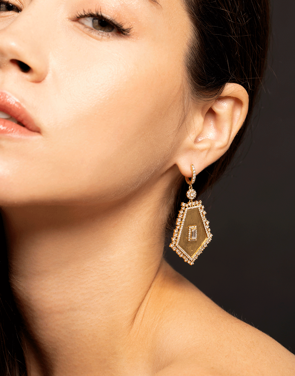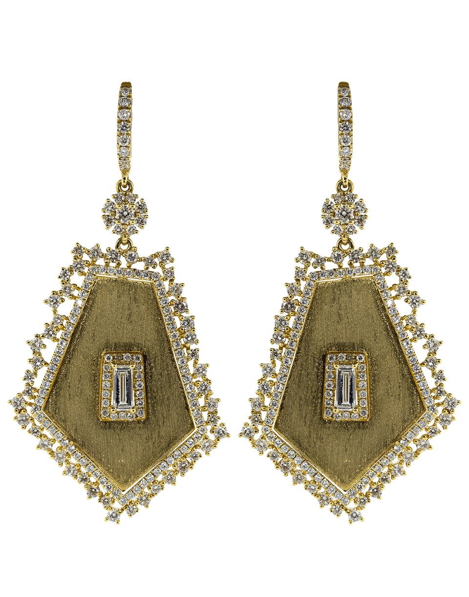 Pentagon slice gold earrings with diamonds by Graziela. These gold and diamond earrings are 2" long.