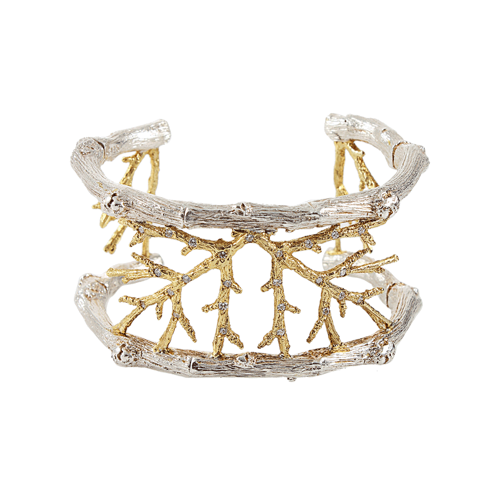Let this twig cuff by K. Brunini fruit its nature of glamour upon your wrist. With a cross between yellow gold, sterling silver and diamonds you will be able to pair this keepsake with almost any fine jewelry piece in your jewelry wardrobe.