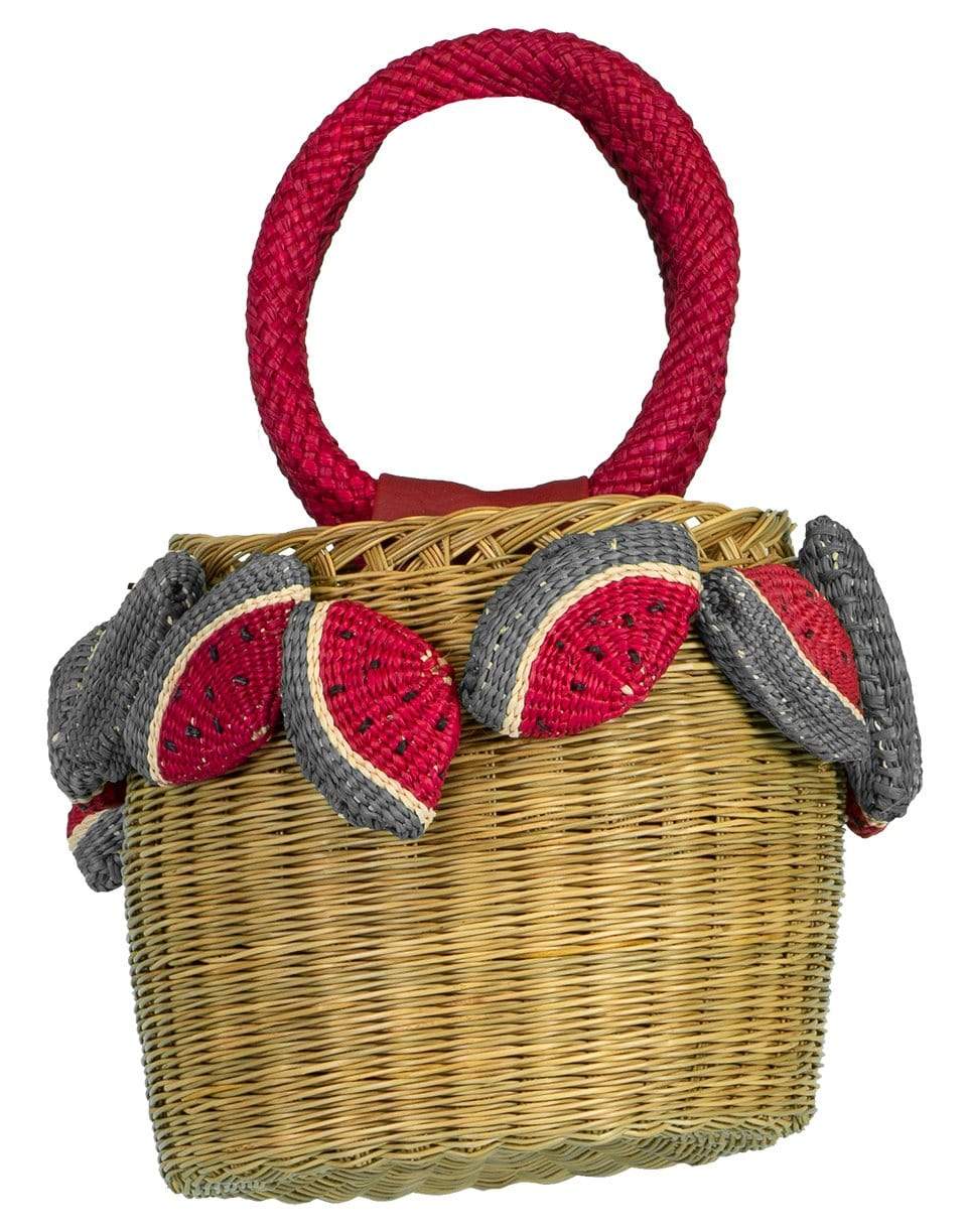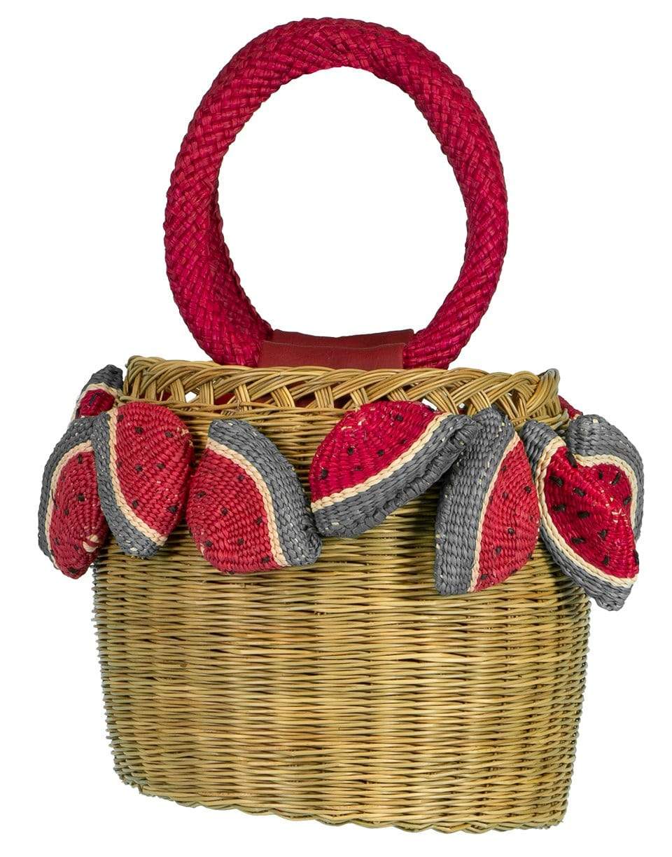 Serpui Lauren watermelon top handle wicker basket bag with an interior drawstring lining, and a crossbody strap.