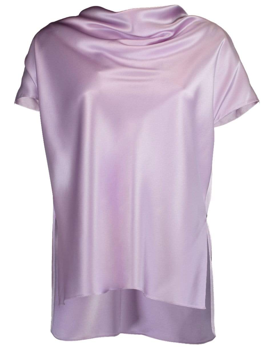 Adam Lippes silk charmeuse cowl neck top with short sleeves, concealed zip closure at back, uneven hem, and a regular fit.