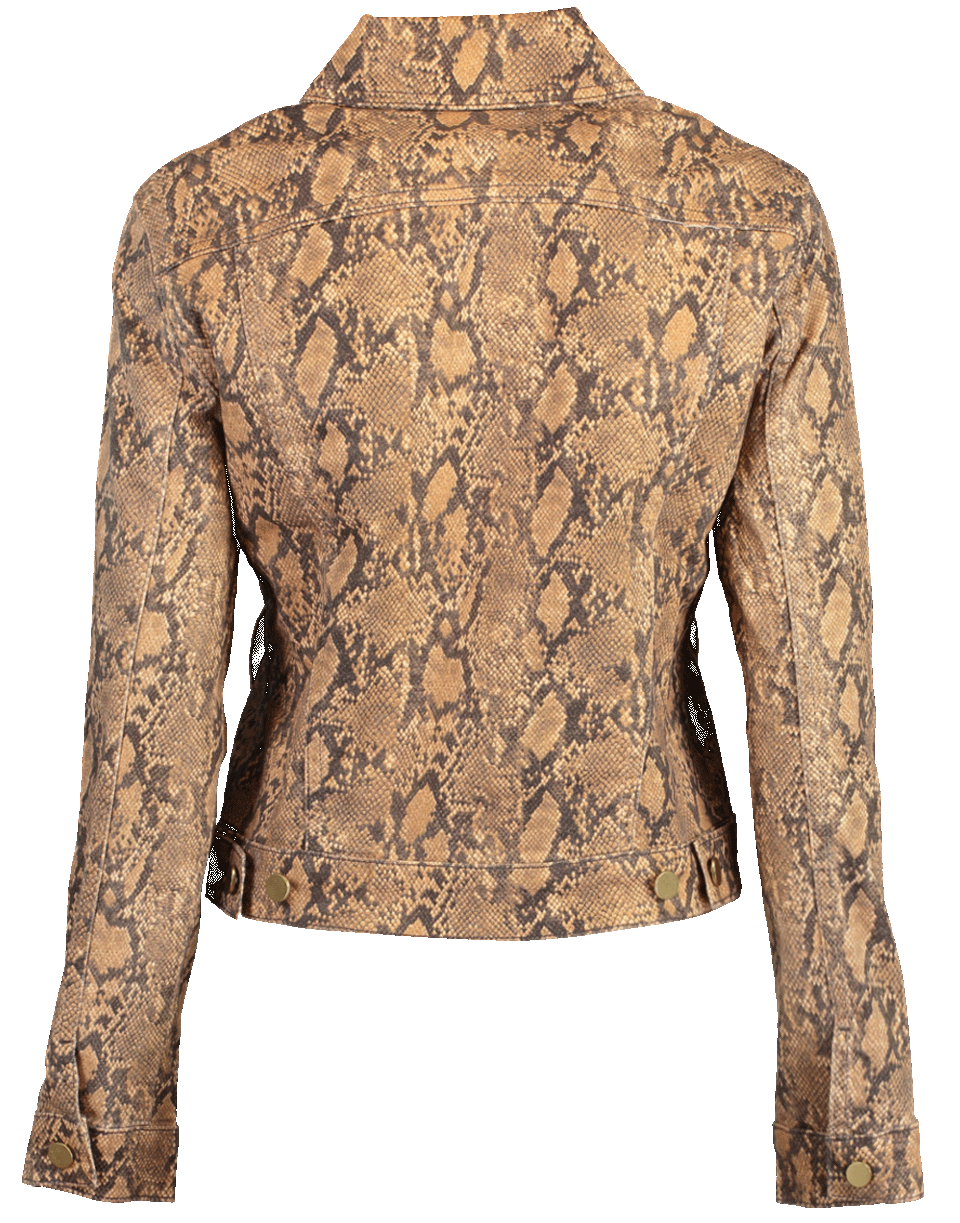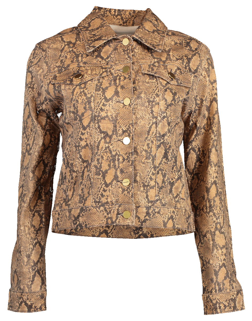 Le Vintage jacket in coated python by Frame Denim features a regular fit with a button front, spread collar, double-breasted pockets, and side pockets.