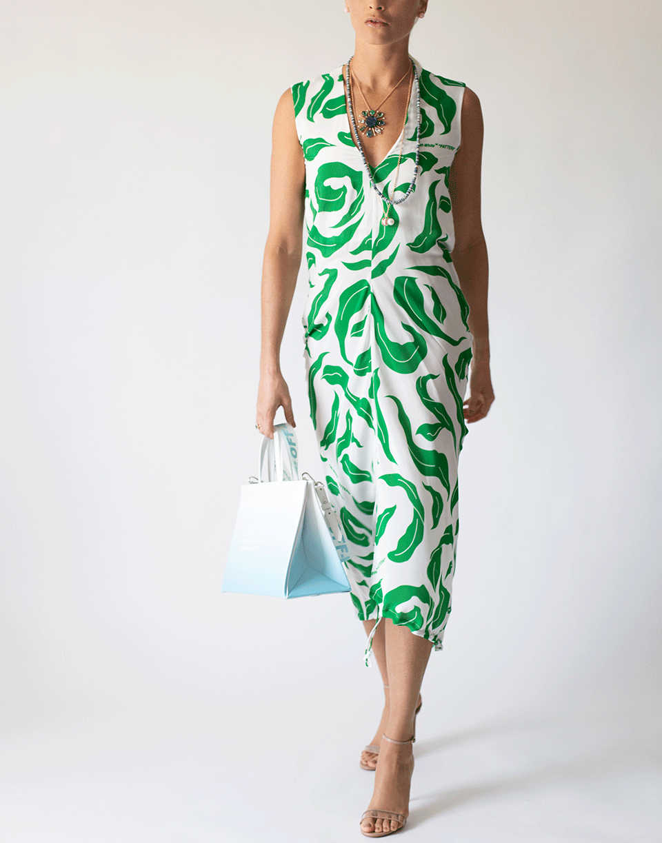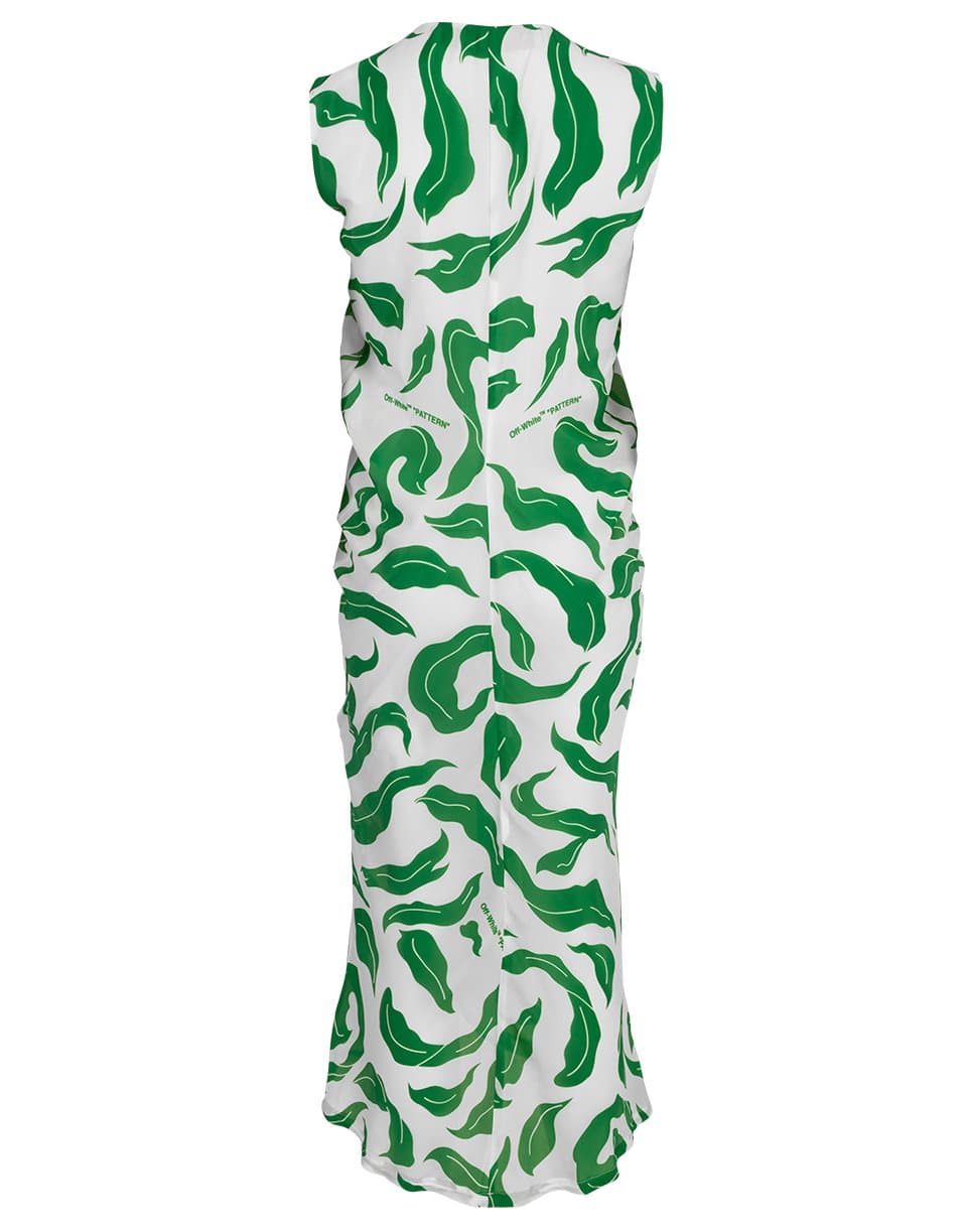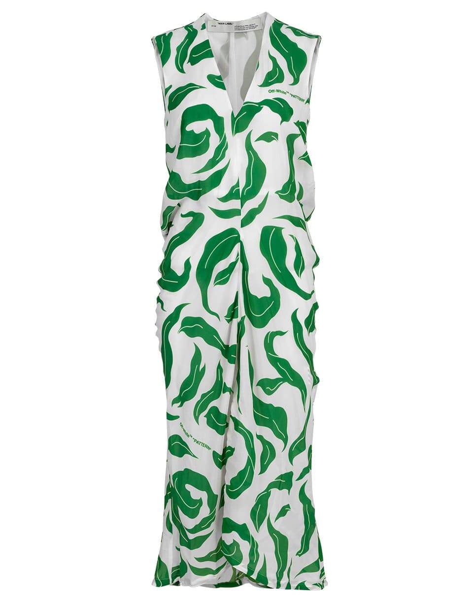 Off-White sleeveless leaves illusion draping dress with green pattern print, slim fit, V-neck, and a mid-length.