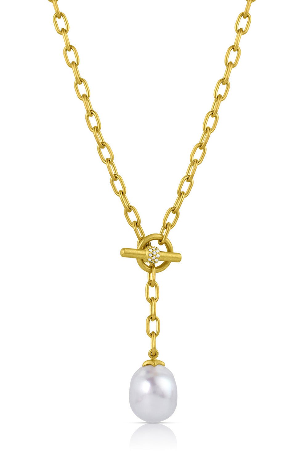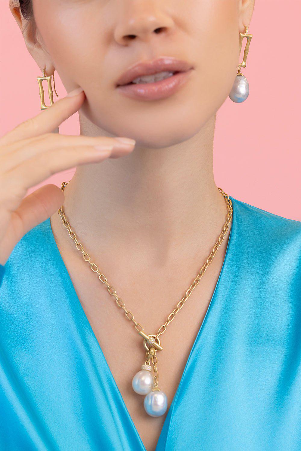 Leigh Maxwell lariat pearl necklace in yellow gold.