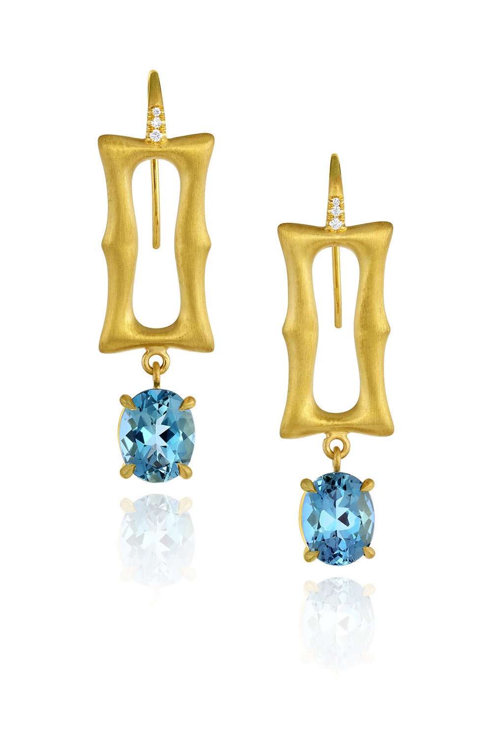 Leigh Maxwell long fram aquamarine earrings in yellow gold.