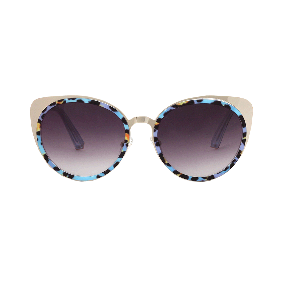 Polished Metal With Blue Leopard Print Acetate Frames, Polished Metal Arms, Leopard Acetate Tips, And Grey Lenses