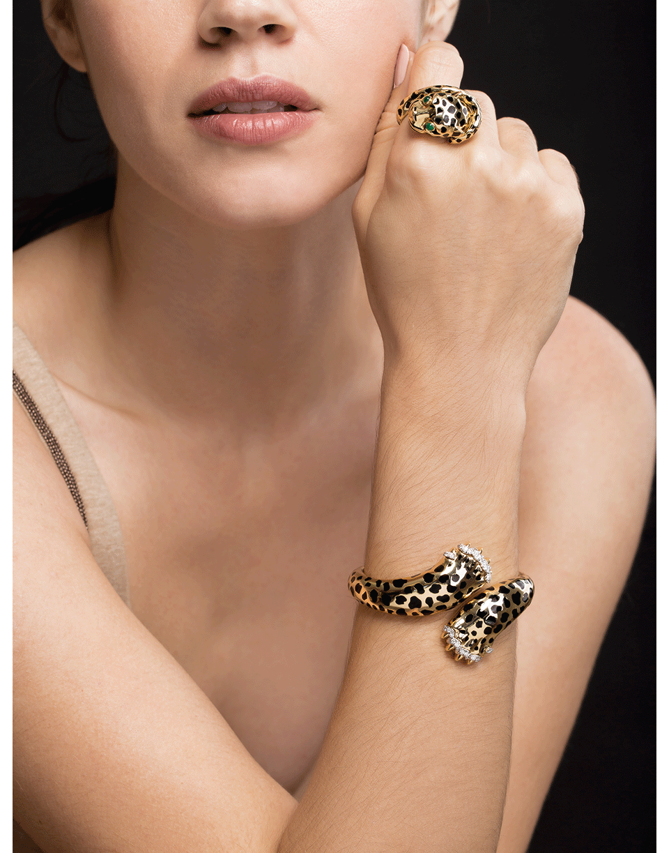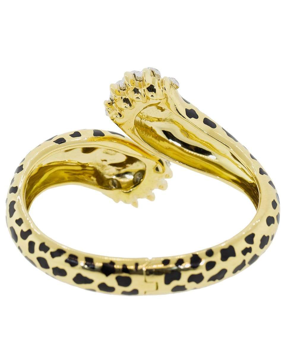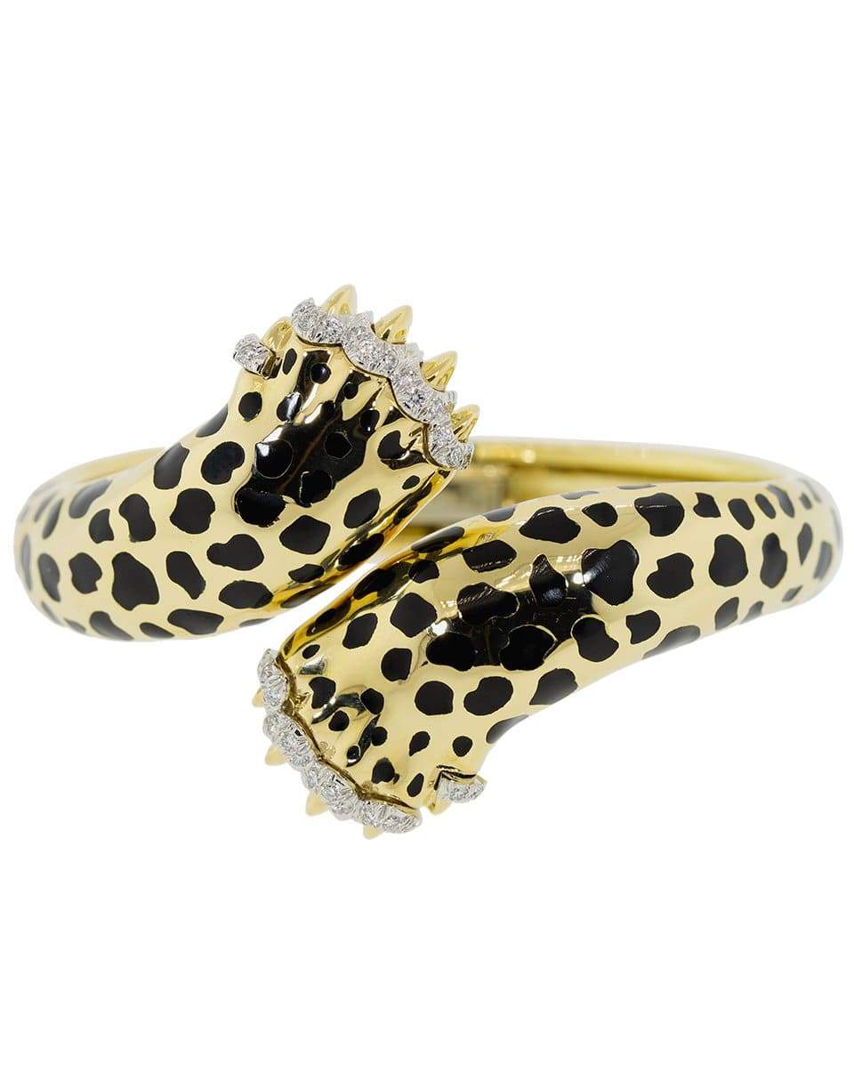 Leopard paw bracelet with black enamel and brilliant cut diamonds set in 18k yellow gold and platinum.