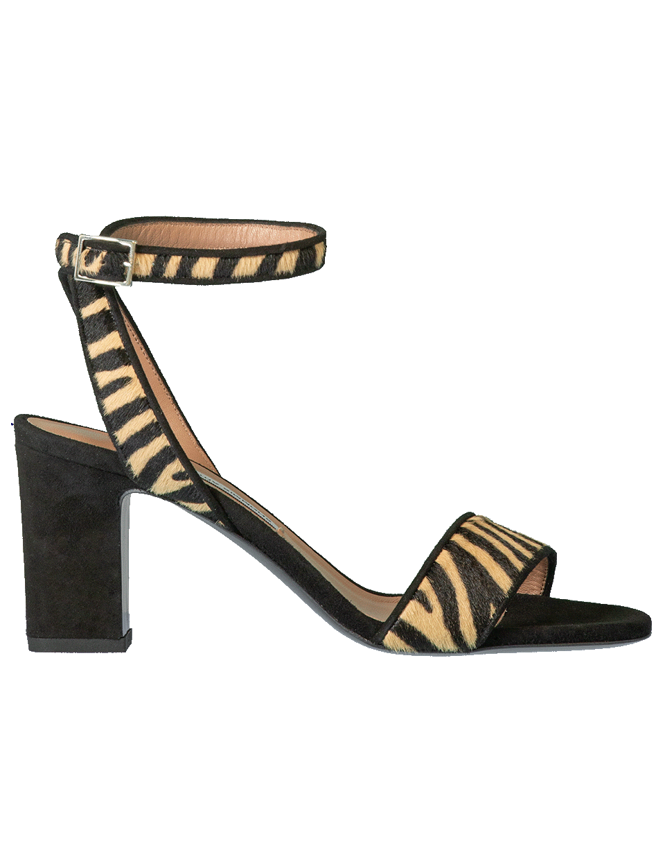The Leticia zebra sandal by Tabitha Simmons has an open toe with a 3" block heel, an adjustable ankle fastening, dyed calf fur and suede details and a leather sole.