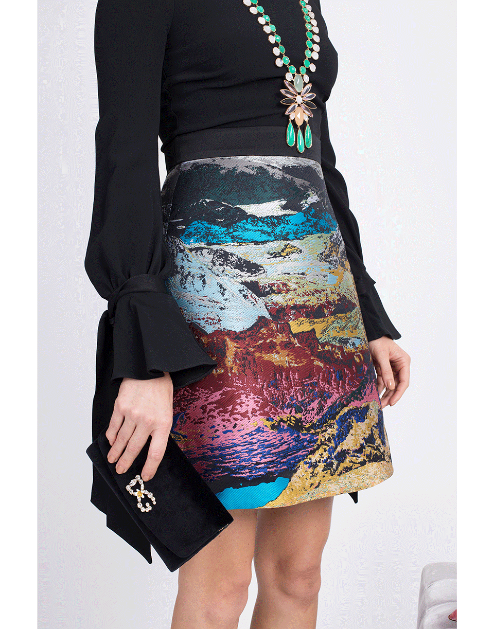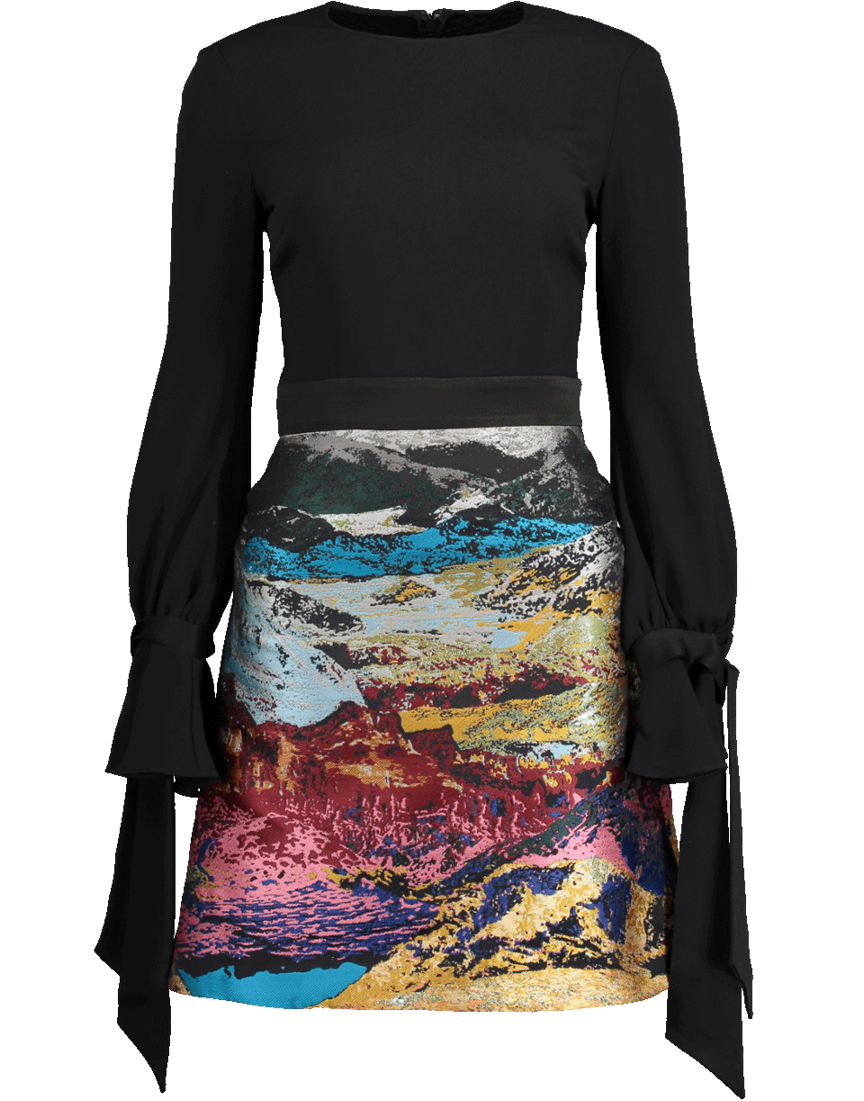The Ligretto mini dress from Mary Katrantzou features a figure flattering silhouette with a round neckline, contrasting multicoloured jacquard print, a satin waistband, concealed back zip, and long sleeves with black satin ties around the cuffs.