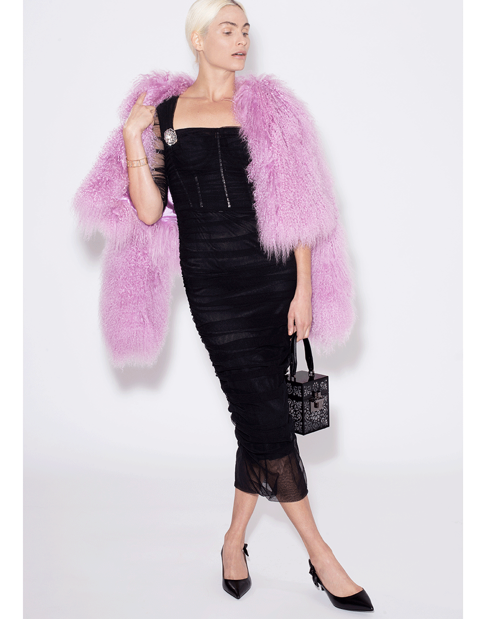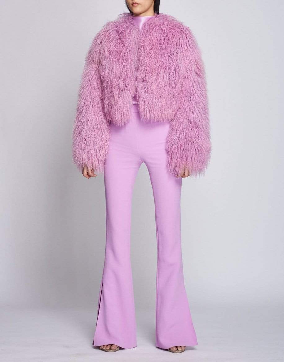 This lilac Tibetan lamb shearling cropped jacket from Cushnie has long sleeves, concealed hook closures at front, and is cropped above the hip.
