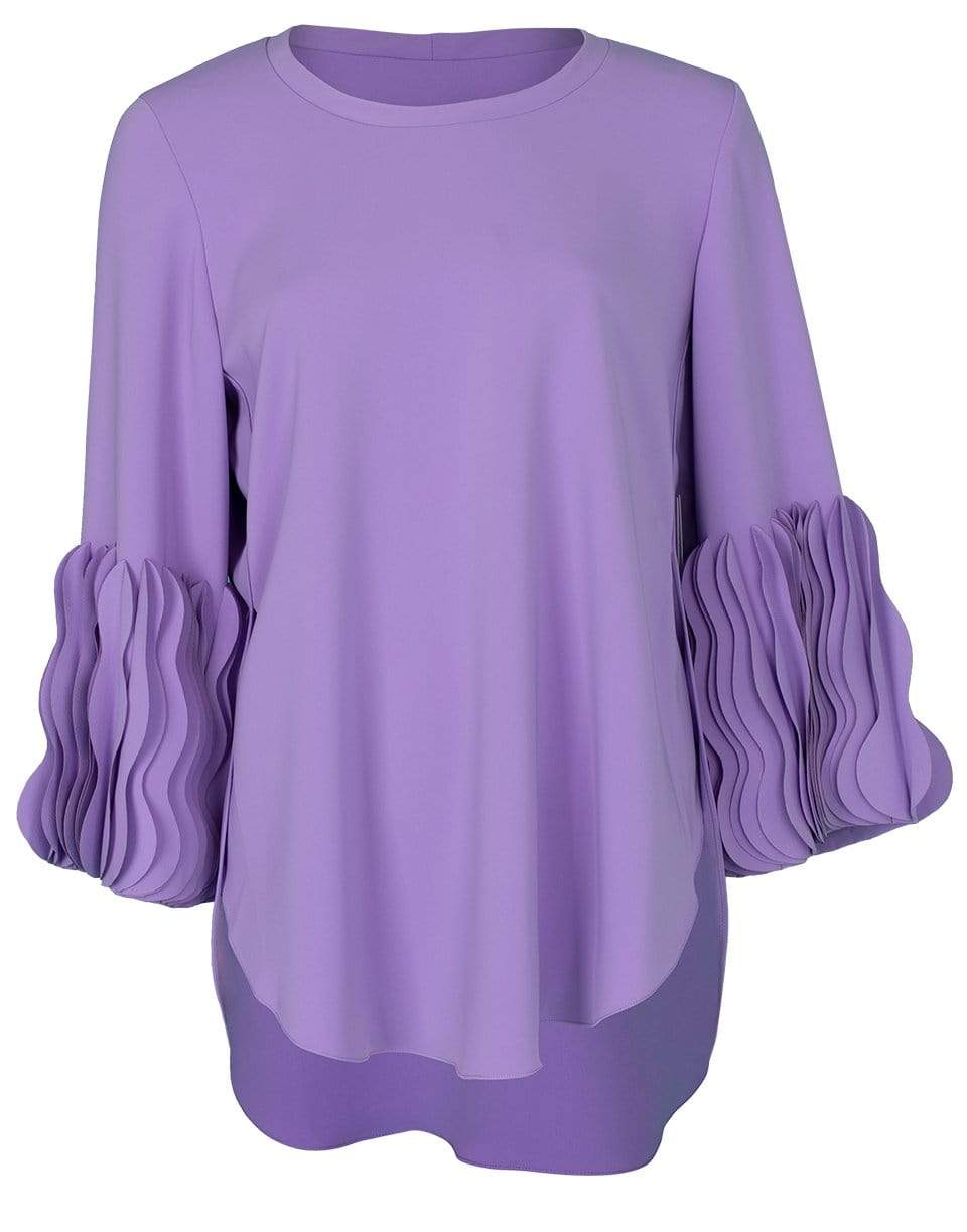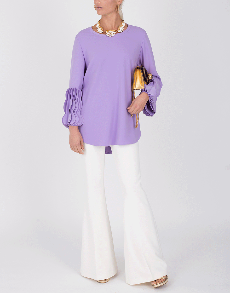 Catherine Regehr silk crepe lilac pull over top with wave cuffs, round neck, curved hem, and a relaxed fit.