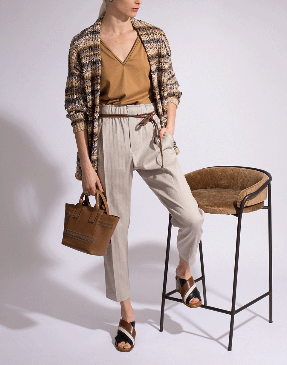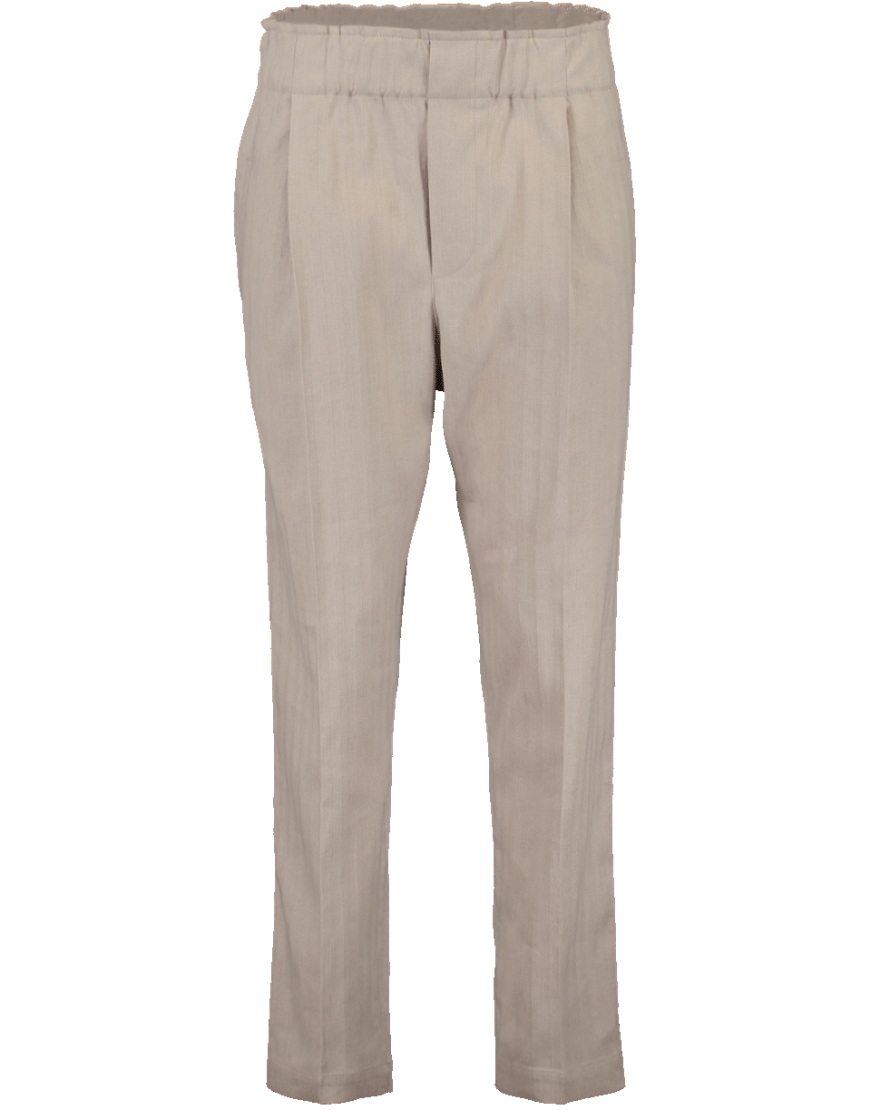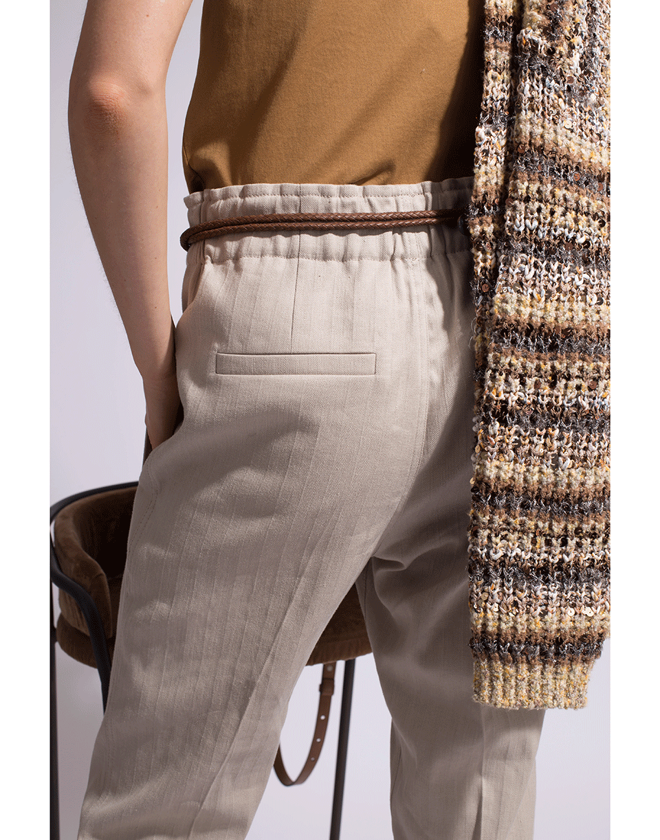 Linen Chevron paper bag pants by Brunello Cucinelli. These mid-rise ankle length pants feature a loose paper bag silhouette with side slash and back pockets.