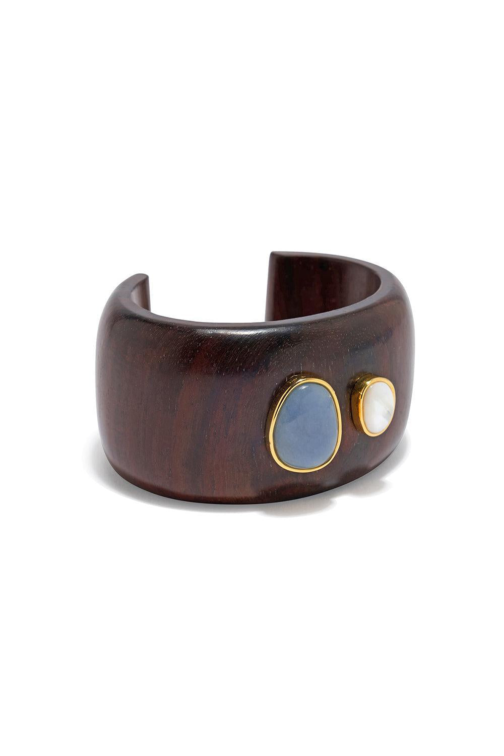 Acacia Wood Cuff With Golf Plated Brass Bexels Set With Mother-Of-Pearl And Angelite Stones