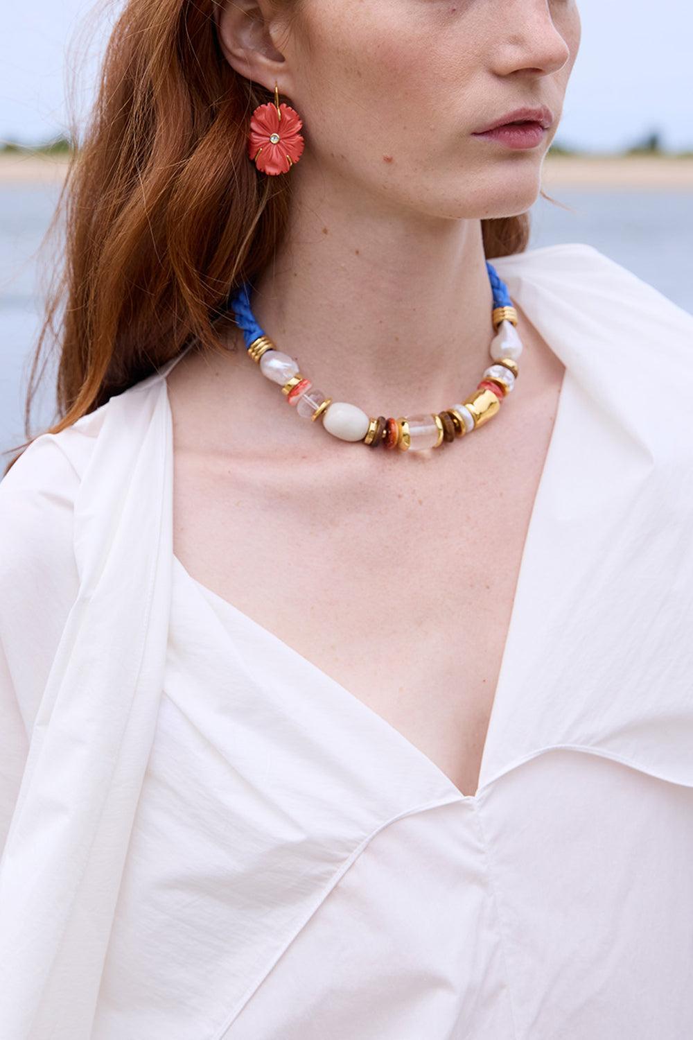 Coral-Colored Carved Quartz, Faceted Sky Blue Topaz