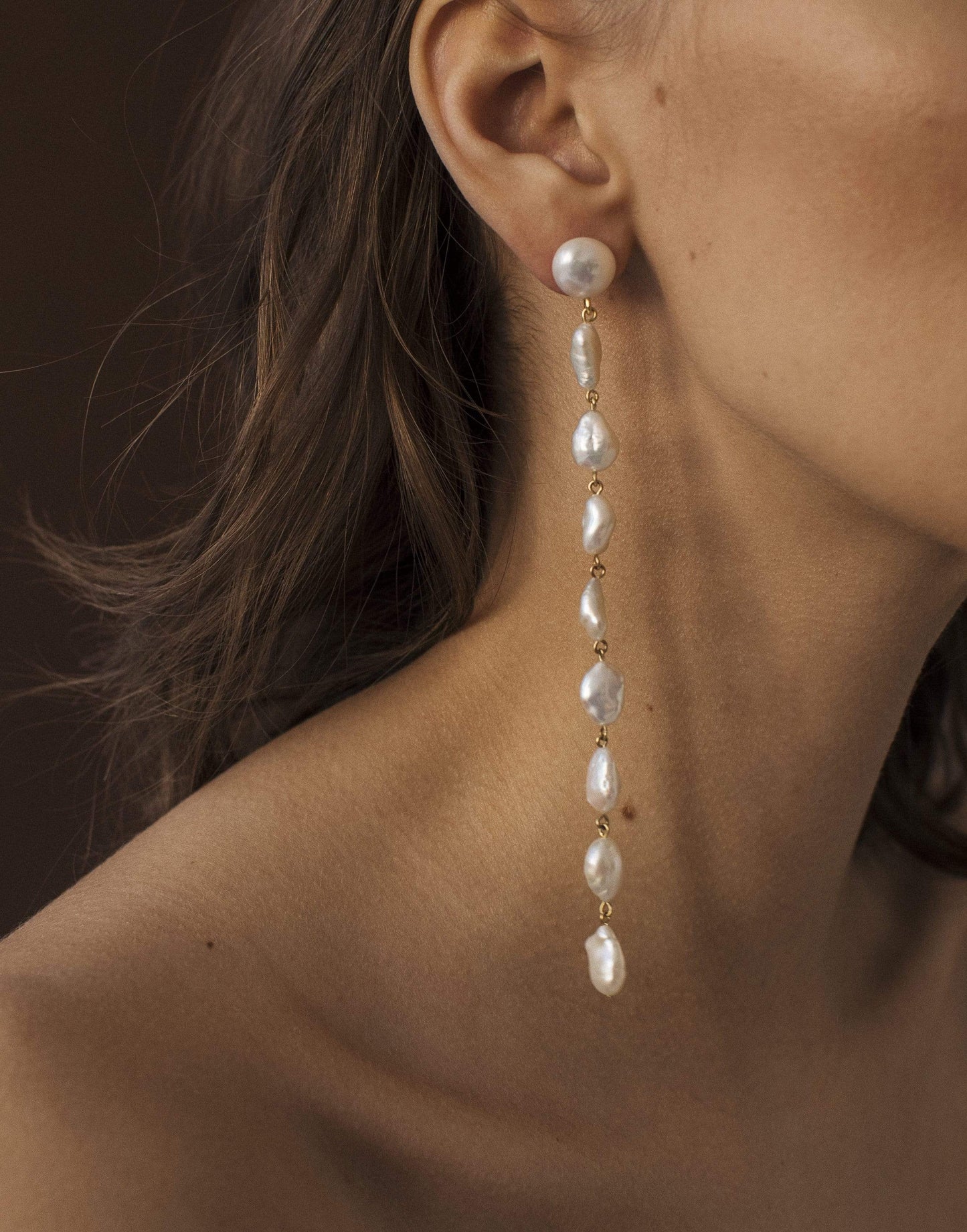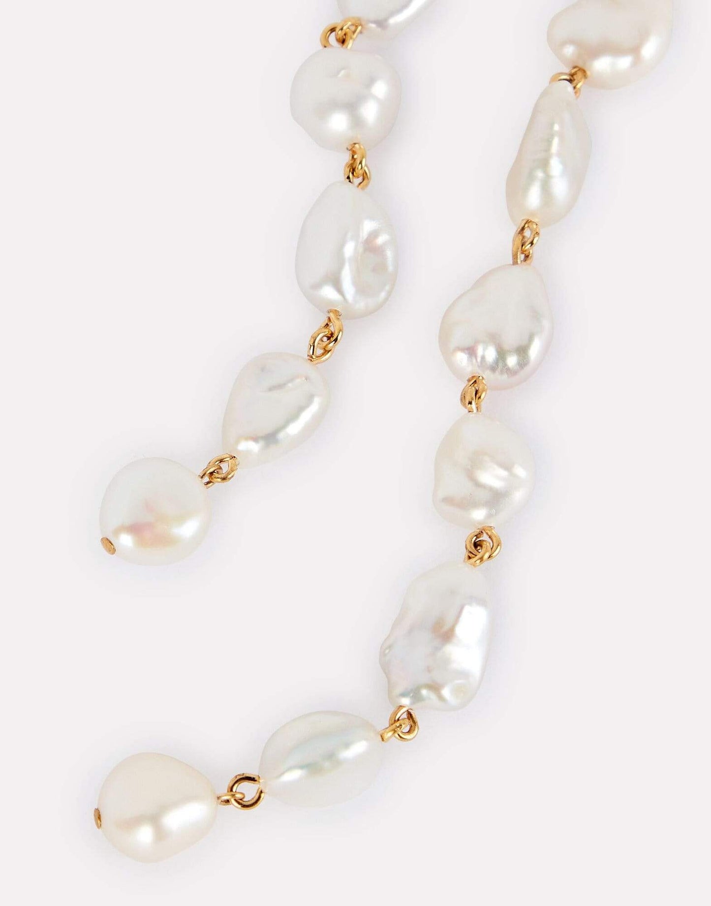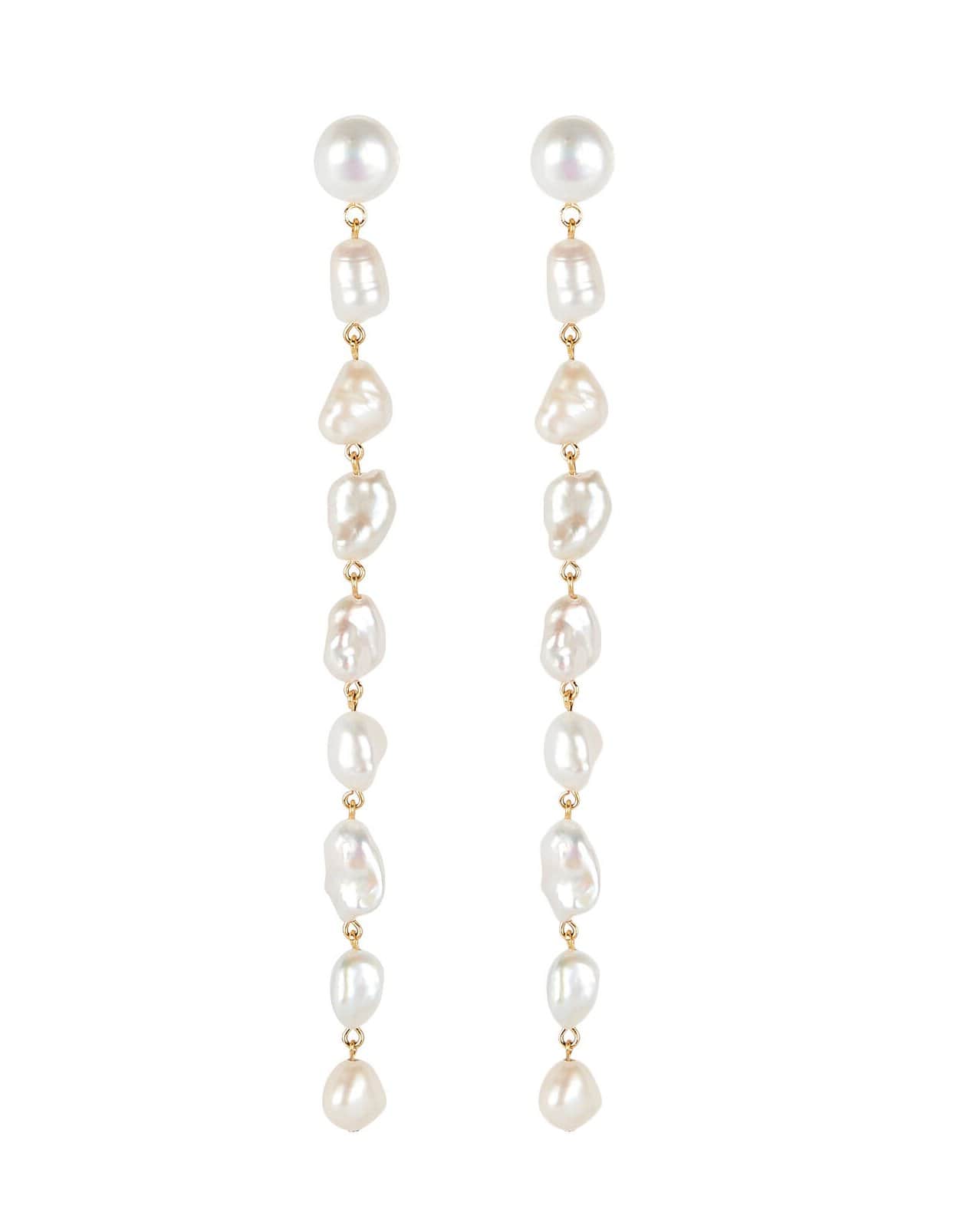 Lizzie Fortunato cairo earrings. Long linked fresh water pearl shoulder duster column earrings.