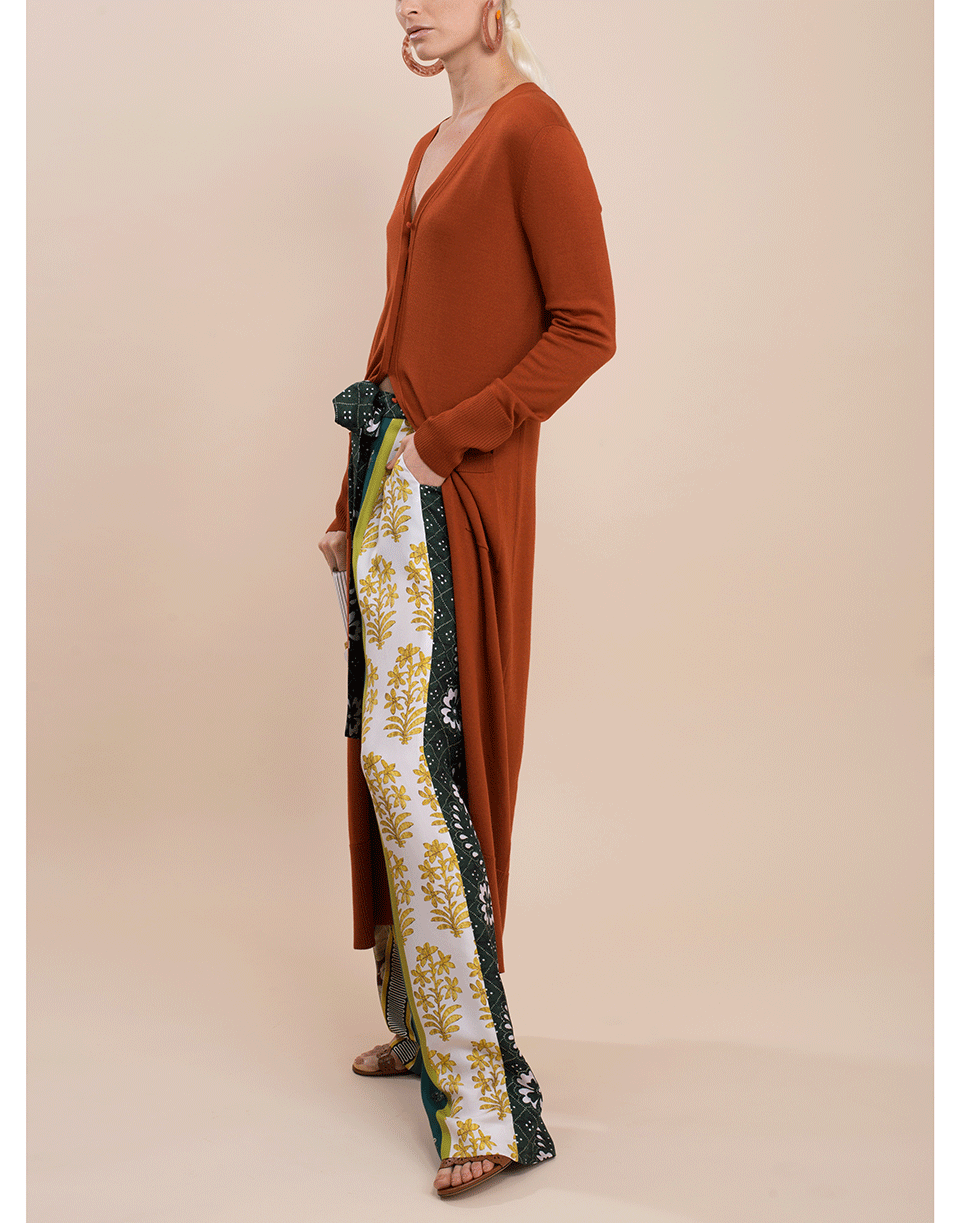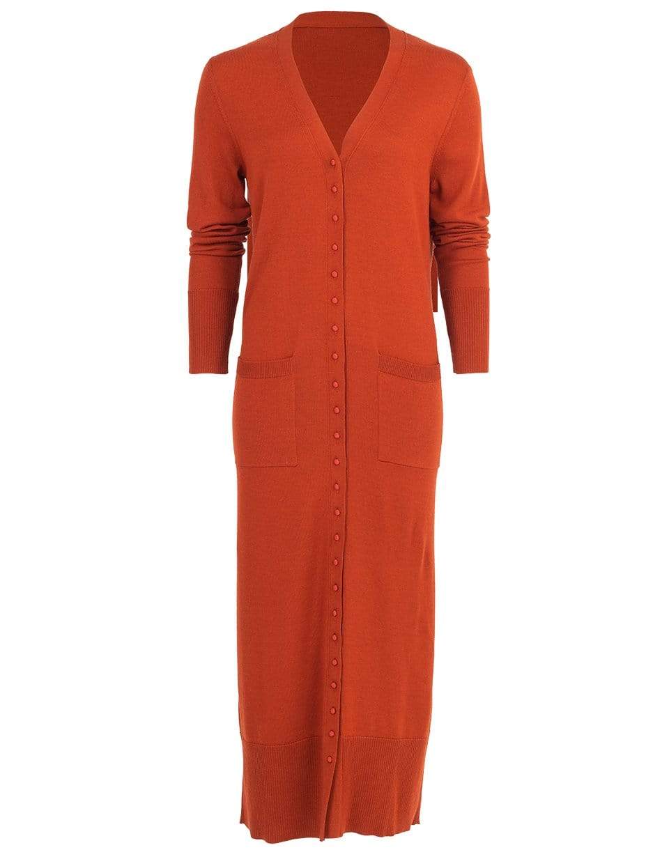 Merino long duster cardigan from Oscar de la Renta featuring long sleeves, front patch pockets, v-neckline, ribbed trims, and button front.