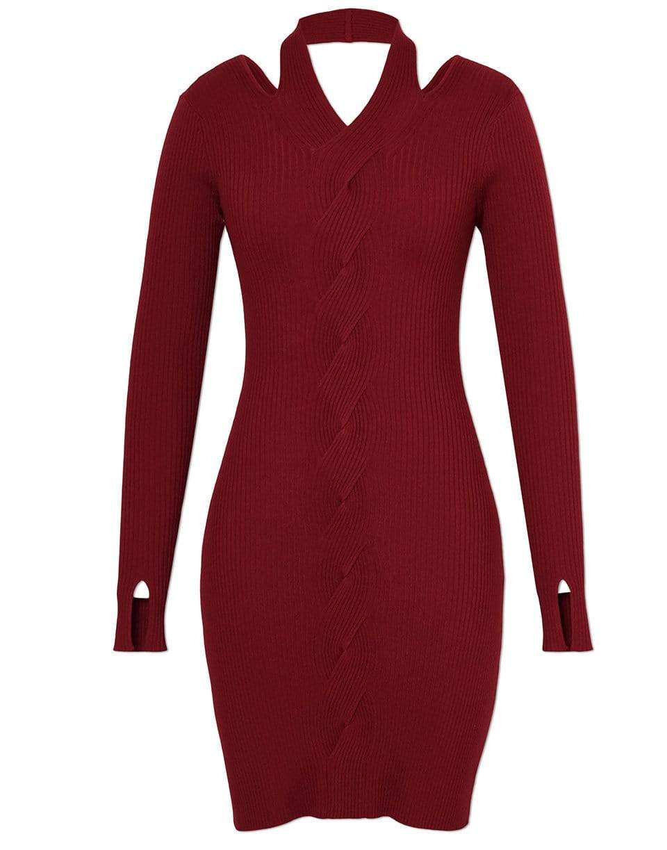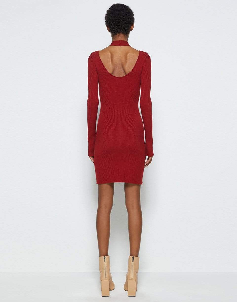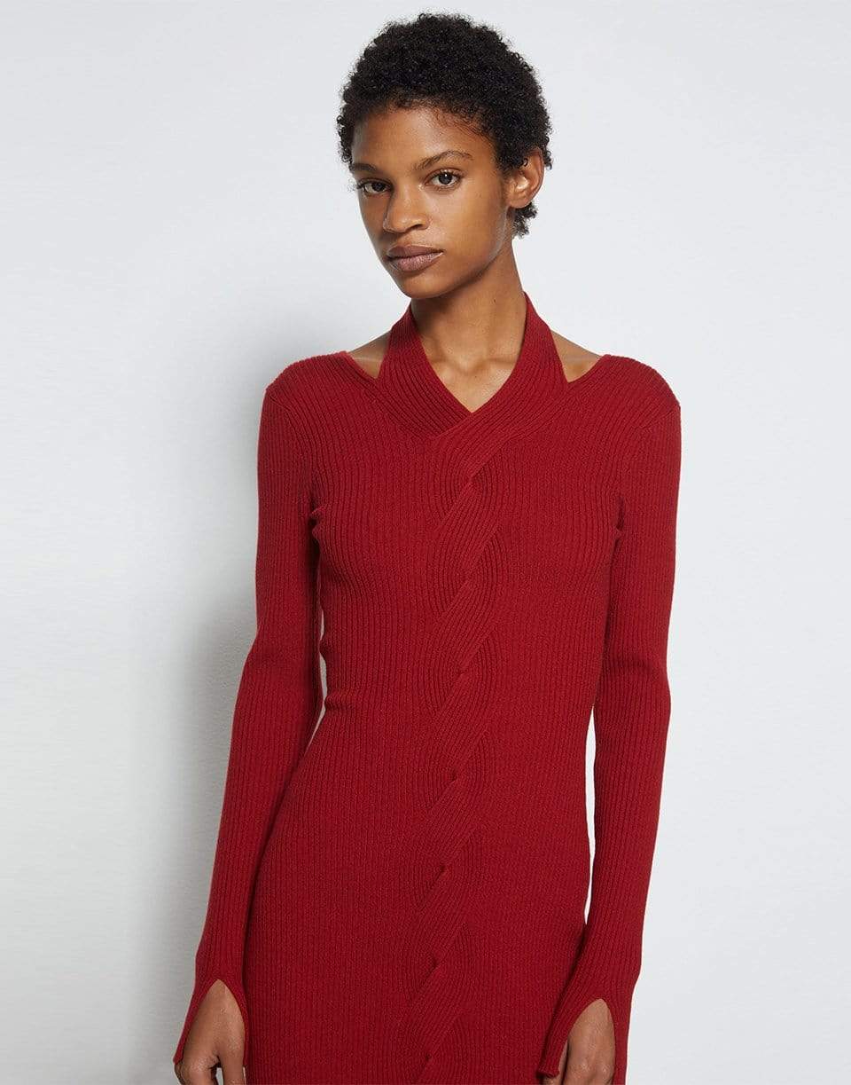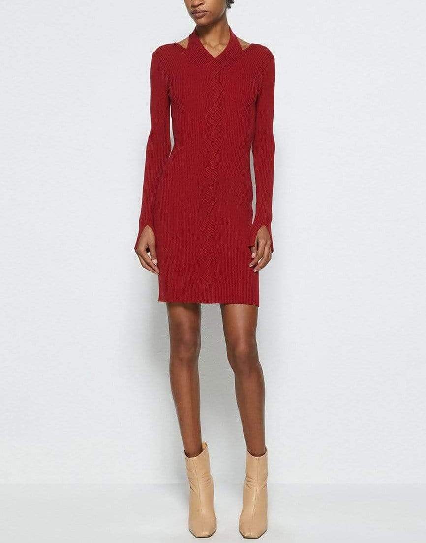 Jonathan Simkhai long sleeve alejandra twisted cable dress in garnet. Knit with allover ribbing for a fitted shape, a twisted cable detail centers this short stretch wool dress.