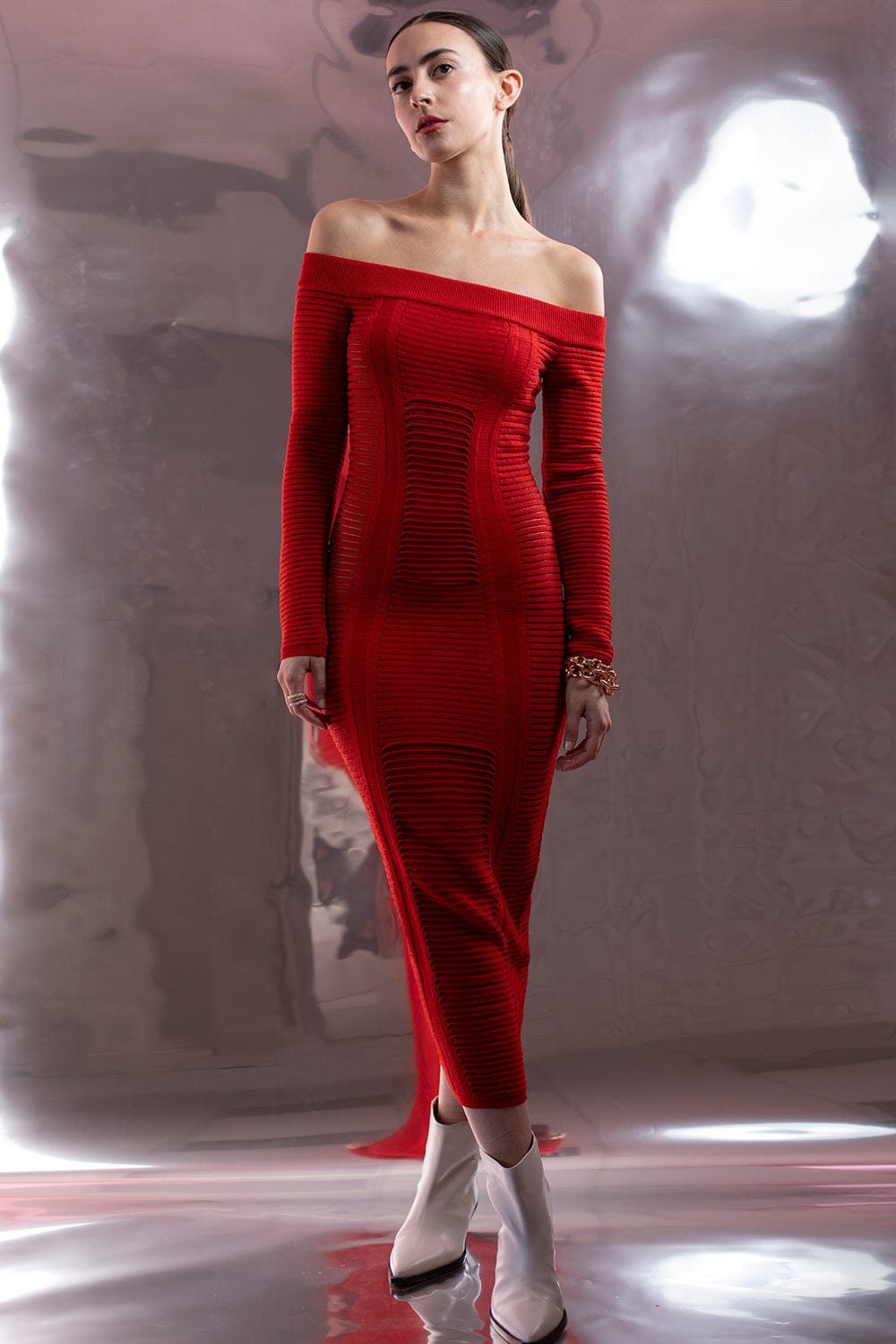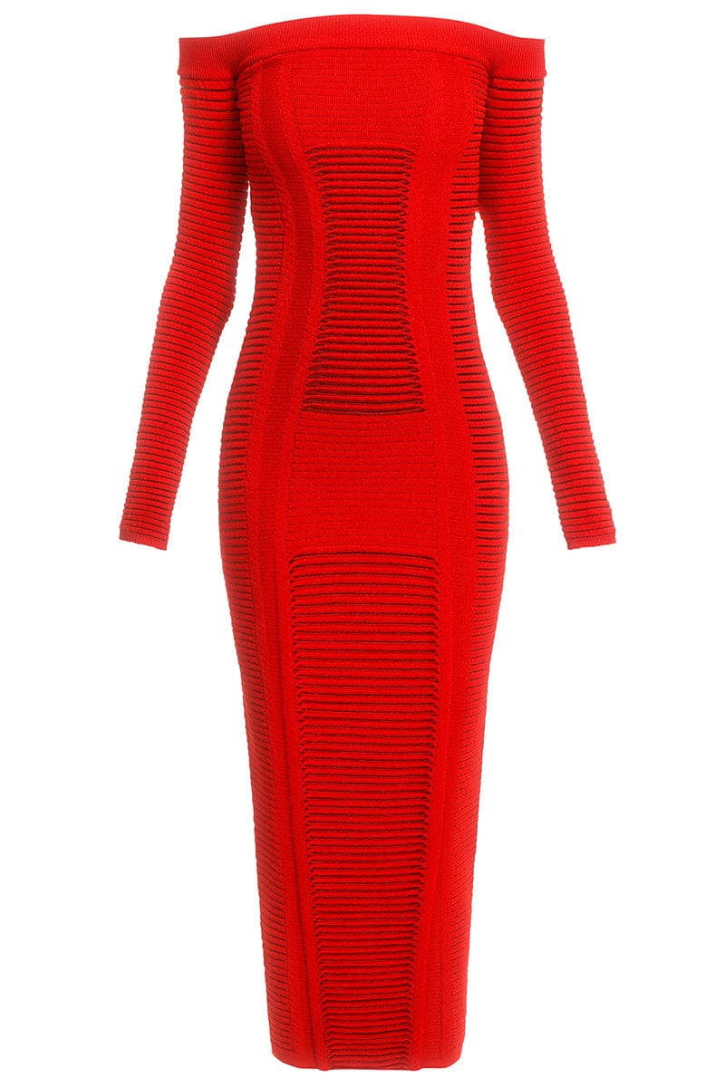 Balmain long sleeve bustier midi dress in 3bx rouge.