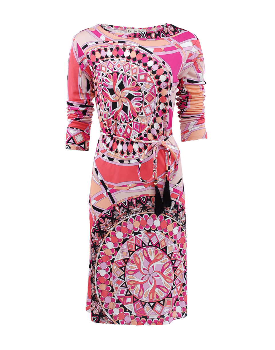 Wow The Crowds In This Pink Tassel Dress From Emilio Pucci Featuring A Round Neck, Long Sleeves, Tie Fastening, A Graphic Print, And A Straight Hem Line