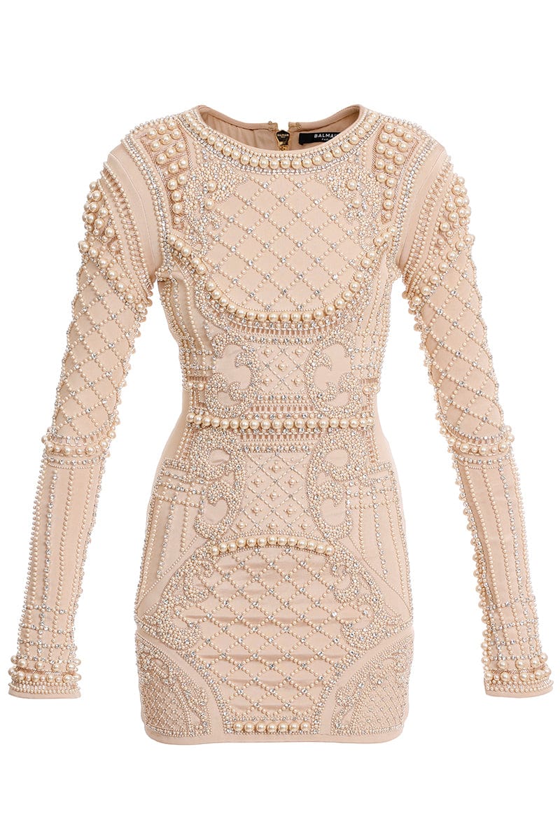 Balmain long sleeve revival embroidered short dress in nude clair.