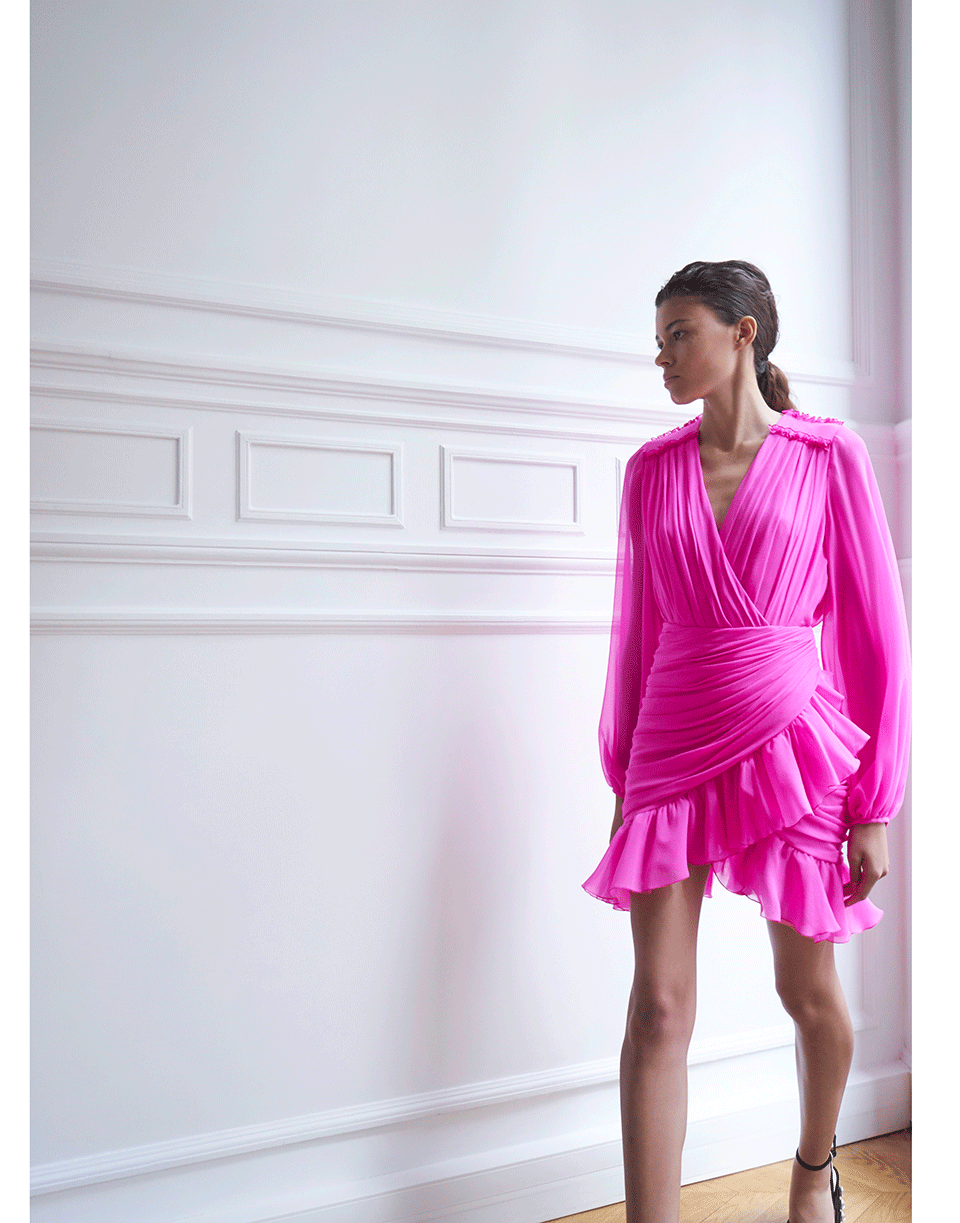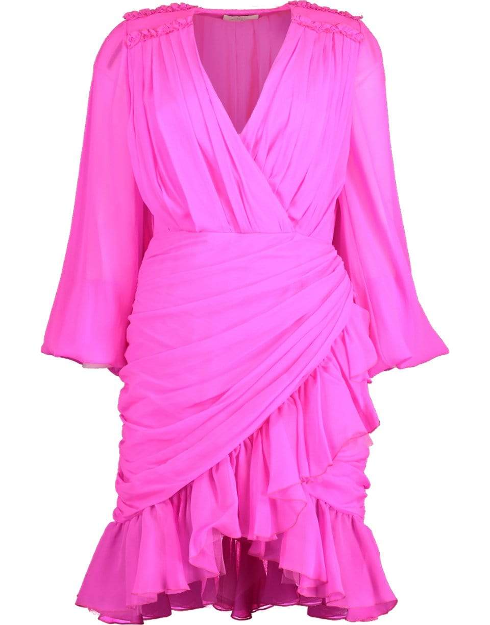 Giambattista Valli asymmetrical ruffle hem dress with a slim fit, V-neck, long sleeves, draped bodice, and a mini length.