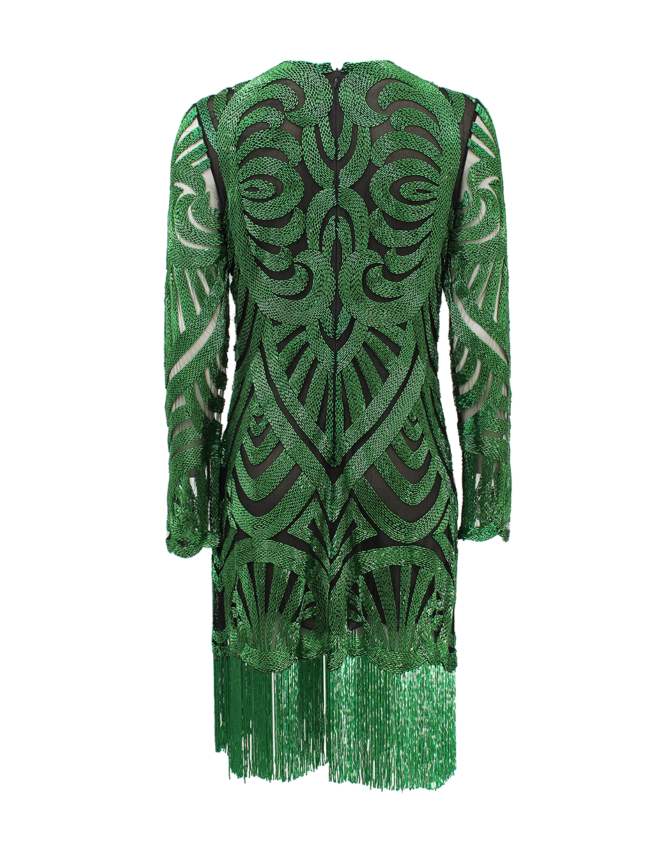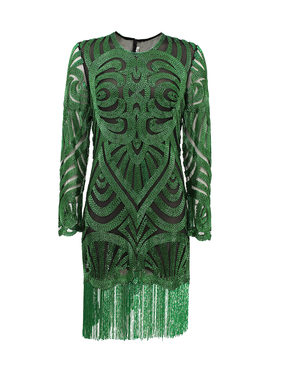 A festive favorite for the holiday season, Naeem Khan’s long sleeve swirl bead dress is a vision. Pair with a metallic clutch and sparkling sandals for the annual holiday cocktail party. Fit: True to Size 100% Silk Dry Clean Available in Green