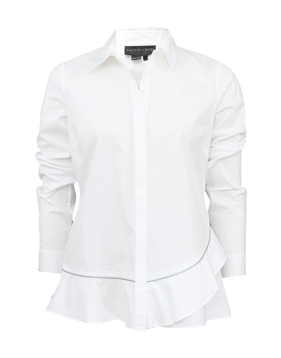 Perfectly preppy with edgy accents, Sachin & Babi’s long sleeve zipper button down blouse is a chic must-have. Pair with cropped pants and quilted flats for weekend errands. Fit: True to Size 97% Cotton, 3% Spandex Dry Clean Available in White