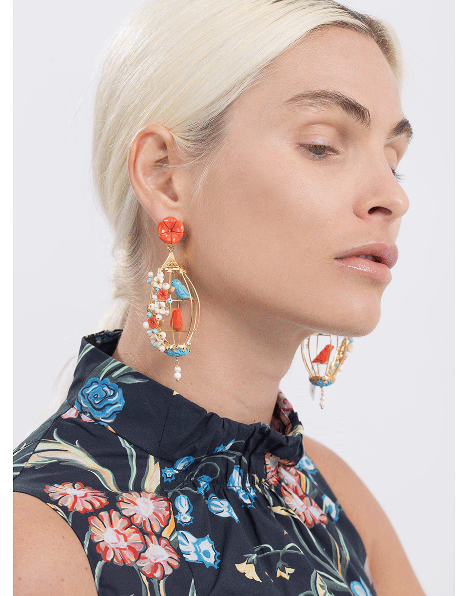Of Rare Origin "Love Bird" earrings featuring intricate bird and flower details.