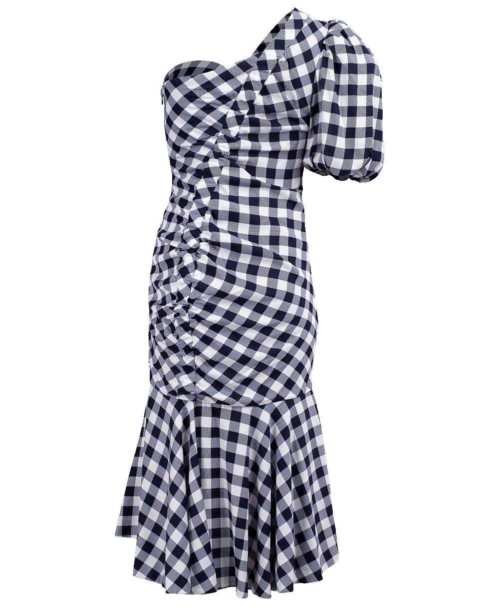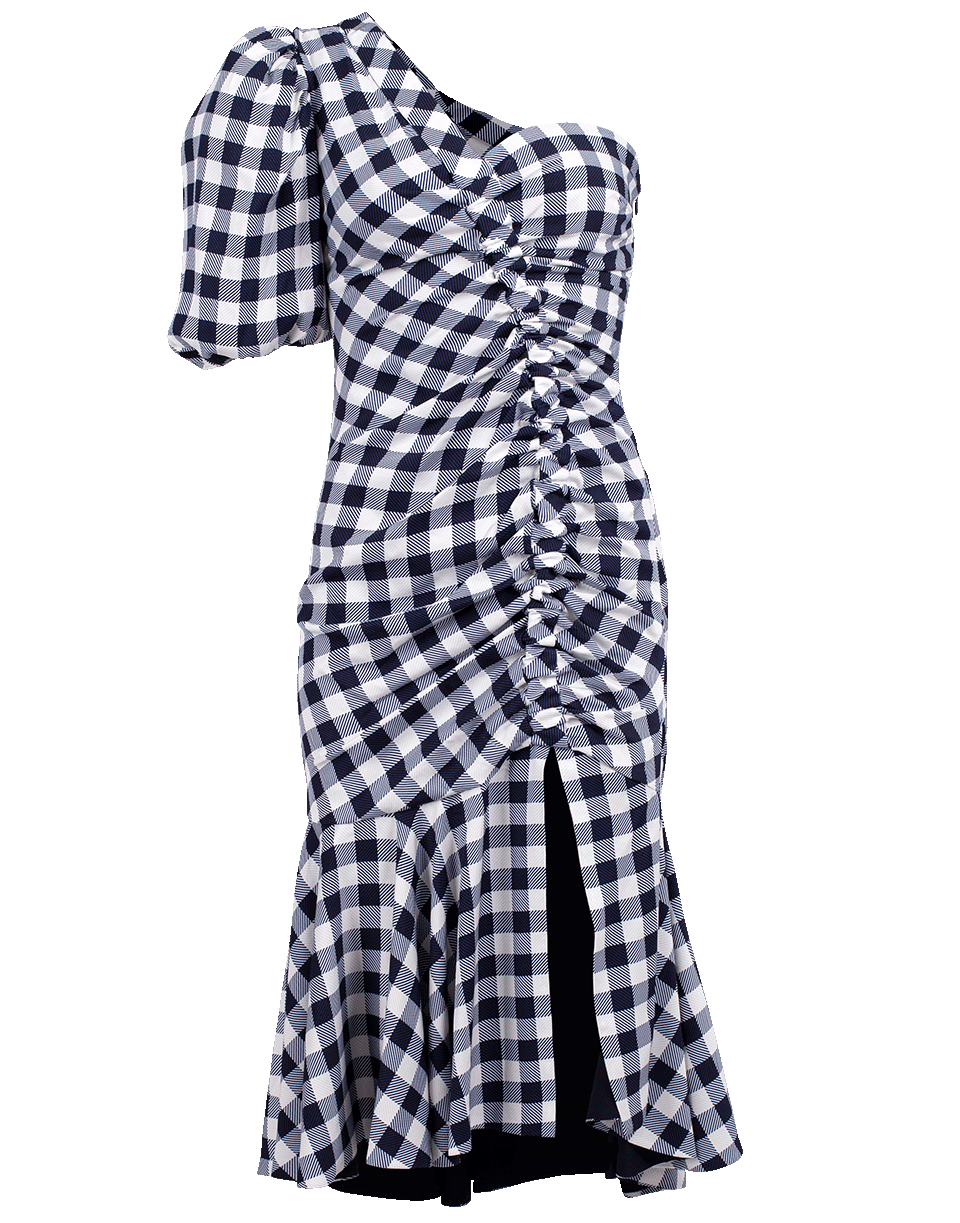 Cut from gingham-print twill, this Jonathan Simkhai dress features a figure flattering midi length silhouette with a one-shoulder neckline, a short puff sleeve, gathered accents at bodice, pleated asymmetrical hemline, a thigh-high slit and a concealed side zip closure.