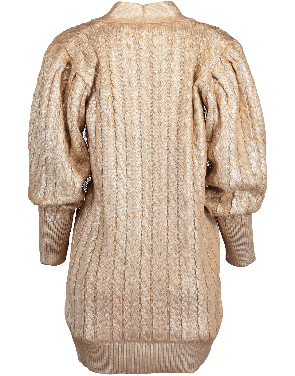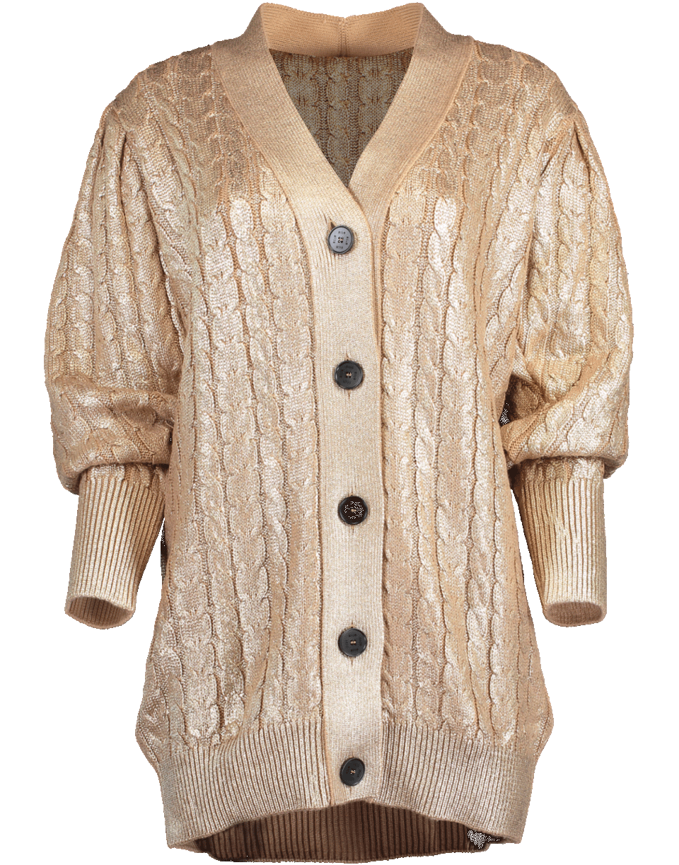 Oversized coated cable knit cardigan from MSGM with button closure at front, v-neckline, long sleeves, thigh length and a gold metallic finish.